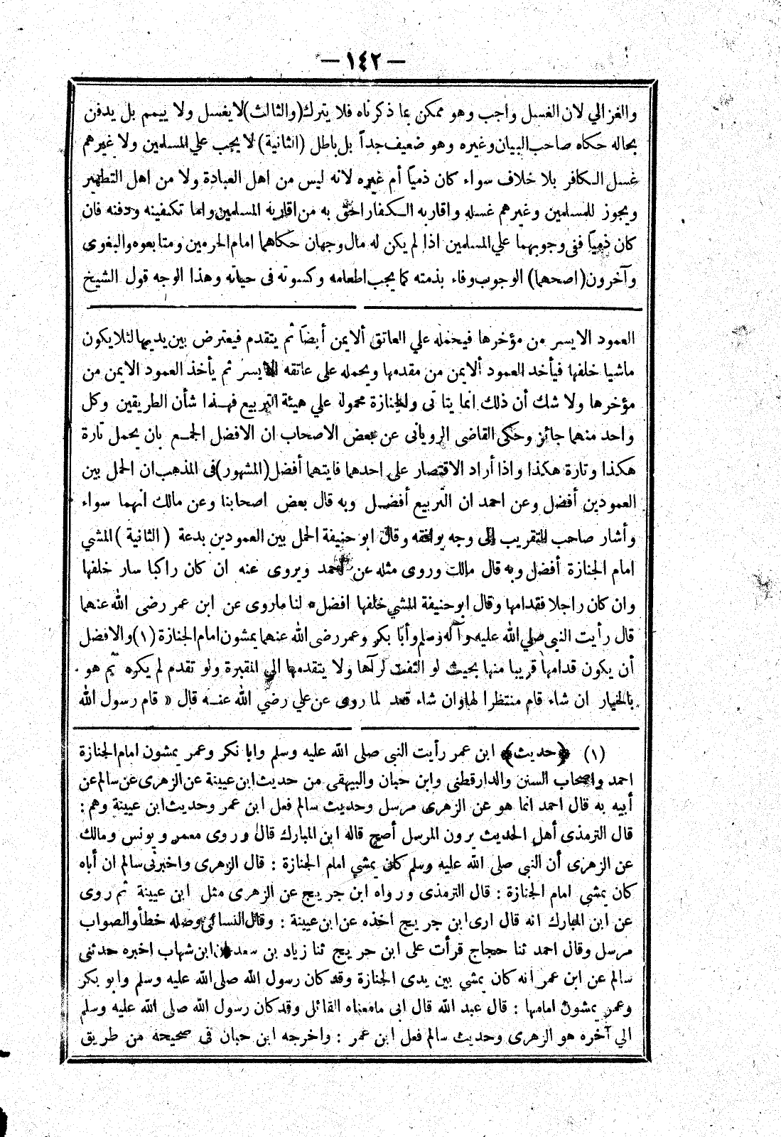 العمود الايسر من مؤخرها فيحمله علي العاتق الايمن أبضا ثم يتقدم فيعترض بين يديها لئلا يكون ماشيا خلفها فيأخد العمود الايمن من مقدمها ويحمله على عاتقه الايسر ثم يأخذ العمود الايمن من مؤخرها ولا شك أن ذلك انما يتاتى والجنازة محموله علي هيئة التربيع فهذا شأن الطريقين وكل واحد منهما جائز وحكى القاضى الروايانى عن بعض الاصحاب ان الافضل الجمع بان يحمل تارة هكذا وتارة هكذا وإذا أراد الا قتصار على احدهما فايتهما أفضل (المشهور) في المذهب ان الحمل بين العمودين أفضل وعن احمد ان التربيع أفضل وبه قال بعض اصحابنا وعن مالك انهما سواء وأشار صاحب التقرى إلى وجه يوافقه وقال أبو حنيفة الحمل بين العمودين بدعة (الثانية) المشي امام الجنازة أفضل وبه قال مالك وروى مثله عن احمد ويروى عنه ان كان راكبا سار خلفها وان كان راجلا فقدامها وقال أبو حنيفة المشي خلفها افضل لنا ما روى عن ابن عمر رضى الله عنهما قال رأيت النبي صلي الله عليه وسلم وسلم وأبا بكر وعمر رضى الله عنهما يمشون امام الجنازة والافضل أن يكون قدامها قريبا منها بحيث لو التفت لرآها ولا يتقدمها الي المقبرة ولو تقدم لم يكره ثم هو