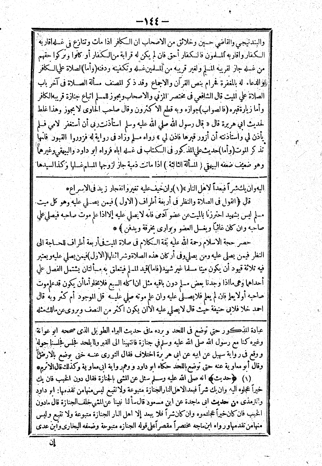 إليه وان يك شرا فبعدا لاهل النار) وان خيف عليه تغير وانفجار زيد في الاسراع * قال (القول في الصلاة والنظر في أربعة أطراف (الاول) فيمن يصلي عليه وهو كل ميت مسلم ليس بشهيد احترزنا بالميت عن عضو آدمى فانه لا يصلي عليه إلا إذا علم موت صاحبه فيصلي على صاحبه وان كان غائبا ويغسل العضو ويوارى بخرقة ويدفن) * حصر حجة الاسلام رحمة الله عليه بقة الكلام في صلاة الميت في أربعة أطراف للحاجة إلى النظر فيمن يصلى عليه ومن يصلي وفي أركان هذه الصلاة وشرائطها (الاول) فيمن يصلي عليه ويعتبر فيه ثلاثة قيود أن يكون ميتا مسلما غير شهيد (فاما) قيد المسلم فيتعلق به مسألتان يشتمل الفصل علي أحداهما وهى ما إذا وجدنا بعض مسلم دون باقيه مثل ان اكله السبع فلا يخلو أما أن يكون قد علم موت صاحبه أولا يعلم فان لم يعلم فلا يصلى عليه وان علم موته صلي عليه قل الموجود أم كثر وبه قال احمد خلا فلابي حنيفة حيث قال لا يصلي عليه الا ان يكون اكثر من النصف ويروى عن مالك مثله