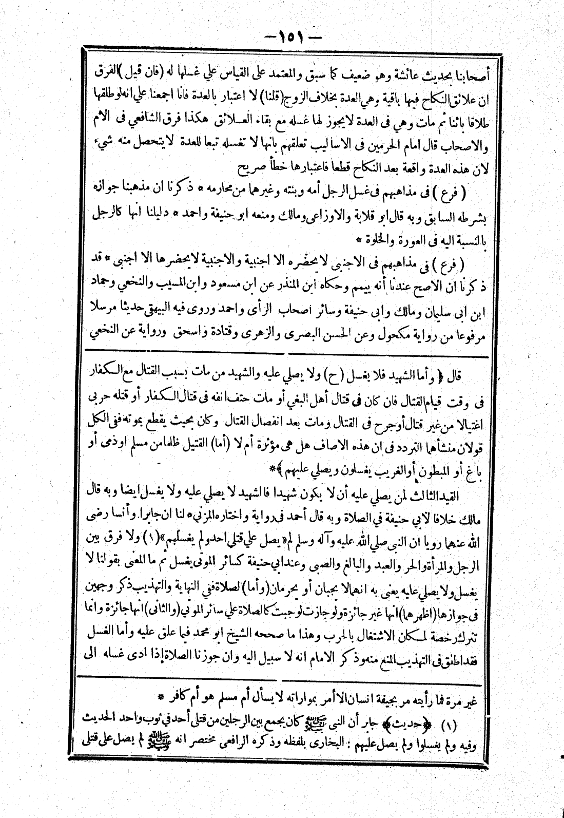 قال (وأما الشهيد فلا يغسل (ح) ولا يصلي عليه والشهيد من مات بسبب القتال مع الكفار في وقت قيام القتال فان كان في قتال أهل البغي أو مات حتف انفه في قتال الكفار أو قبله حربى اغتيالا من غير قتال أو جرح في القتال ومات بعد انفصال القتال وكان بحيث يقطع بموته ففى الكل قولان منشأهما التردد في ان هذه الاوصاف؟ هل هي مؤثرة أم لا (أما) القتيل ظلما من مسلم أو ذمى أو باغ أو المبطون أو الغريب يغسلون ويصلي عليهم) * القيد الثالث لمن يصلي عليه أن لا يكون شهيدا فالشهيد لا يصلي عليه ولا يغسل ايضا وبه قال مالك خلافا لابي حنيفة في الصلاة وبه قال أحمد في رواية واختاره المزني * لنا ان جابرا وأنسا رضى الله عنهما رويا ان النبي صلي الله عليه وسلم لم (يصل علي قتلى احد ولم يغسلهم) ولا فرق بين الرجل والمرأة والحر والعبد والبالغ والصبى وعند ابي حنيفة كسائر الموتى يغسل ثم ما المعنى بقولنا لا يغسل ولا يصلي عليه يغنى به انهما لا يجبان أو يحرمان (واما) لصلاة ففي النهاية والتهذيب ذكر وجهين في جوازها (اظهرهما) انها غير جائزة ولو جازت لوجبت كالصلاة علي سائر الموتي (والثانى) انها جائزة وانما تترك رخصة لمكان الاشتغال بالحرب وهذا ما صححه الشيخ أبو محمد فيما علق عليه وأما الغسل فقدا طلق في التهذيب المنع منه وذكر الامام انه لا سبيل إليه وان جوزنا الصلاة إذا ادى غسله إلى