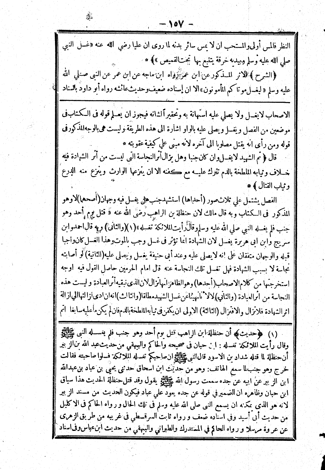الاصحاب يغسل ولا يصلي عليه استهانة به تحقيرا لشانه فيجوز ان يعلم قوله في الكتاب في موضعين من الفصل ويغسل ويصلى عليه وبالواو اشارة إلى هذه الطريقة وليست هي بالوجه المذكور في قوله ومن رأى انه يقتل مصلوبا إلى آخره لانه مبنى علي كيفية عقوبته * قال (ثم الشهيد لا يغسل وان كان جنبا وهل يزال أثر النجاسة التى ليست من أثر الشهادة فيه خلاف وثيابه الملطخة بالدم تترك عليه مع كفنه الا ان ينزعها الوارث وينزع منه الدرع وثياب القتال) * الفصل يشتمل علي ثلاث صور (أحداها) استشهد جنب هل يغسل فيه وجهان (اصحهما) لا وهو المذكور في الكتاب وبه قال مالك لان حنظلة بن الراهب رضى الله عنه (قتل يوم أحد وهو جنب فلم يغسله النبي صلي الله عليه وسلم وقال رأيت الملائكة تغسله) (والثانى) وبه قال احمد وابن سريج وابن ابى هريرة يغسل لان الشهادة انما تؤثر في غسل وجب بالموت وهذا الغسل كان واجبا قبله والوجهان متفقان على انه لا يصلى عليه وعند أبى حنيفة يغسل ويصلى عليه (الثانية) لو أصابته نجاسة لا بسبب الشهادة فهل تغسل تلك النجاسة عنه قال امام الحرمين حاصل القول فيه اوجه استخرجتها من كلام الاصحاب (أحدها) وهو الظاهر انها تزال لان الذى نبقيه أثر العبادة وليست هذه النجاسة من اثر العبادة (والثاني) لا لانا نهينا عن غسل الشهيد مطلقا (والثالث) انه ان ادى ازالتها الي ازالة اثر الشهادة فلا تزال والا فتزال (الثالثة) الاولى ان يكفن في ثيابه الملطخة بالدم فان لم يكن ما عليه سابغا اتم