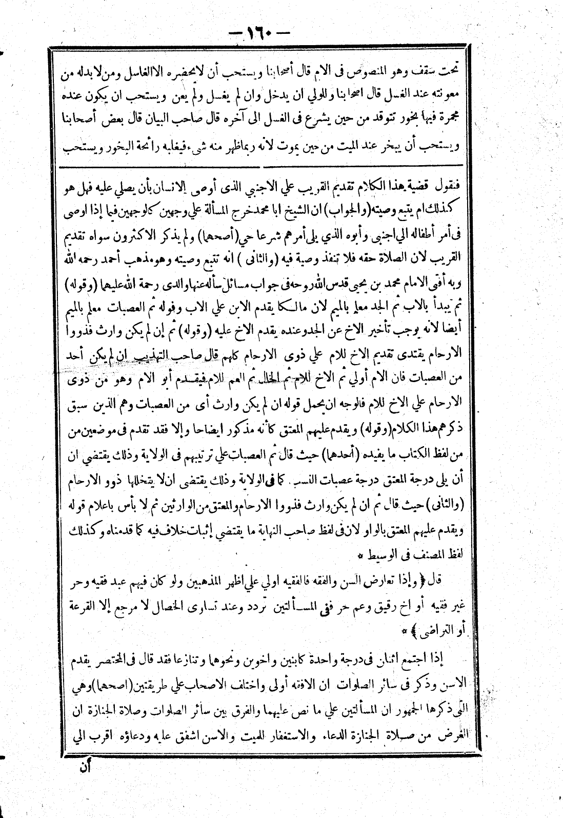الارحام يقتضى تقديم الاخ للام علي ذوى الارحام كلهم قال صاحب التهذيب ان لم يكن أحد من العصبات فان الام أولي ثم الاخ للام ثم الخال ثم العم للام فيقدم أبو الأم وهو من ذوى الارحام علي الاخ للام فالوجه ان يحمل قوله ان لم يكن وارث أي من العصبات وهم الذين سبق ذكرهم هذا الكلام (وقوله) ويقدم عليهم المعتق كأنه مذكور ايضاحا وإلا فقد تقدم في موضعين من من لفظ الكتاب ما يفيده (أحدهما) حيث قال ثم العصبات علي ترتيبهم في الولاية وذلك يقتضي ان أن يلى درجة المعتق درجة عصبات النسب كما في الولاية وذلك يقتضى ان لا يتخللها ذوو الارحام (والثانى) حيث قال ثم ان لم يكن وارث فذووا الارحام والمعتق من الوارثين ثم لا بأس باعلام قوله ويقدم عليهم المعتق بالواو لان في لفظ صاحب النهاية ما يقتضي إثبات خلاف فيه كما قدمناه وكذلك لفظ المصنف في الوسيط * قال (وإذا تعارض السن والفقه فالفقيه اولي علي اظهر المذهبين ولو كان فيهم عبد فقيه وحر غير فقيه أو اخ رقيق وعم حر ففى المسألتين تردد وعند تساوى الخصال لا مرجع إلا القرعة أو التراضي) * إذا اجتمع اثنان في درجة واحدة كابنين واخوين ونحوهما وتنازعا فقد قال في المختصر يقدم الاسن وذكر في سائر الصلوات ان الافقه أولى واختلف الاصحاب علي طريقتين (اصحهما) وهي التى ذكرها الجمهور ان المسألتين علي ما نص عليهما والفرق بين سائر الصلوات وصلاة الجنازة ان الغرض من صلاة الجنازة الدعا والاستغفار للميت والاسن اشفق عليه ودعاؤه اقرب الي
