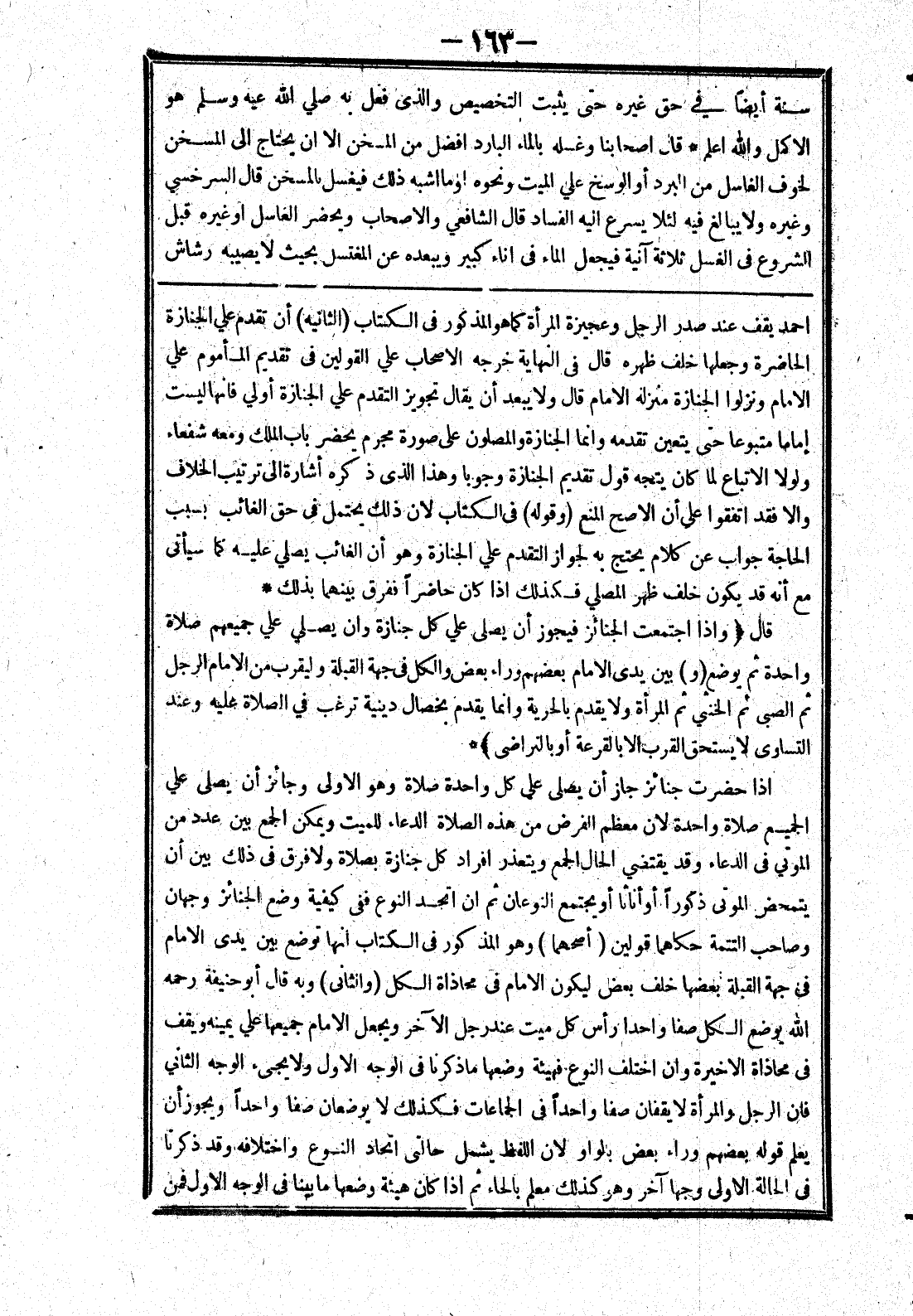 احمد يقف عند صدر الرجل وعجيزة المرأة كما هو المذكور في الكتاب (الثانيه) أن تقدم علي الجنازة الحاضرة وجعلها خلف ظهره قال في النهاية خرجه الاصحاب علي القولين في تقديم المأموم علي الامام ونزلوا الجنازة منزلة الامام قال ولا يبعد أن يقال تجويز التقدم علي الجنازة أولي فانها ليست إماما متبوعا حتى يتعين تقدمه وانما الجنازة والمصلون على صورة مجرم يحضر باب الملك ومعه شفعاء ولولا الاتباع لما كان يتجه قول تقديم الجنازة وجوبا وهذا الذى ذكره أشارة إلى ترتيب الخلاف والا فقد اتفقوا على أن الاصح المنع (وقوله) في الكتاب لان ذلك يحتمل في حق الغائب بسبب الحاجة جواب عن كلام يحتج به لجواز التقدم علي الجنازة وهو أن الغائب يصلي عليه كما سيأتي مع أنه قد يكون خلف ظهر المصلي فكذلك إذا كان حاضرا ففرق بينهما بذلك * قال (وإذا اجتمعت الجنائز فيجوز أن يصلى علي كل جنازة وان يصلى علي جميعهم صلاة واحدة ثم يوضع (و) بين يدى الامام بعضهم وراء بعض والكل في جهة القبلة وليقرب من الامام الرجل ثم الصبى ثم الخنثى ثم المرأة ولا يقدم بالحرية وانما يقدم بخصال دينية ترغب في الصلاة عليه وعند التساوى لا يستحق القرب الا بالقرعة أو بالتراضى) * إذا حضرت جنائز جاز أن يصلى علي كل واحدة صلاة وهو الاولى وجائز أن يصلى علي الجميع صلاة واحدة لان معظم الفرض من هذه الصلاة الدعاء للميت ويمكن الجمع بين عدد من الموتي في الدعاء وقد يقتضي الحال الجمع ويتعذر افراد كل جنازة بصلاة ولا فرق في ذلك بين أن