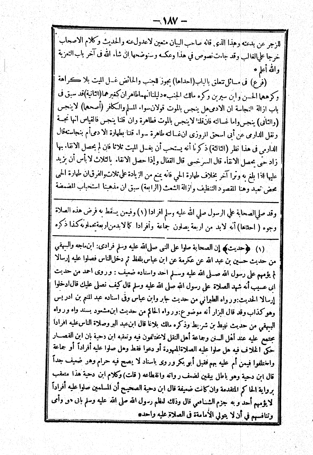 وقد صلي الصحابة علي الرسول صلي الله عليه وسلم افرادا وفيمن يسقط به فرض هذه الصلاة وجوه (احدها) أنه لابد من اربعة يصلون جماعة وافرادا كما لا بد من اربعة يجملونه كذا ذكره