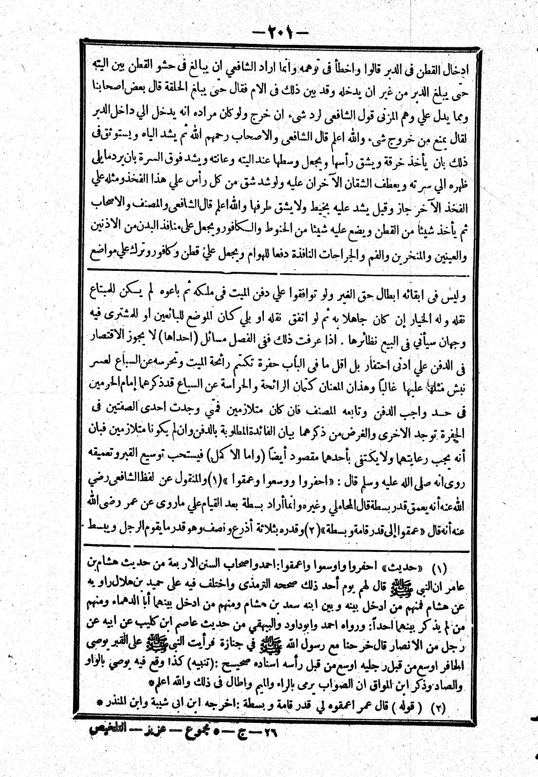 إذا عرفت ذلك ففى الفصل مسائل (احداها) لا يجوز الاقتصار في الدفن علي ادنى احتفار بل اقل ما في البأب حفرة تكتم رائحة الميت وتحرسه عن السباع لعسر نبش مثها عليها غالبا وهذان المعنيان كتمان الرائحة والحراسة عن السباع قد ذكرهما إمام الحرمين في حد واجب الدفن وتابعه المصنف فان كانا متلازمين فمي وجدت احدى الصفتين في الحفرة توجد الاخرى والغرض من ذكرهما بيان الفائدة المطلوبة بالدفن وان لم يكونا متلازمين فبان أنه يجب رعايتهما ولا يكتفى بأحدهما مقصود أيضا (واما الاكمل) فيستحب توسيع القبر وتعميقه روى انه صلى الله عليه وسلم قال: (احفروا ووسعوا وعمقو) والمنقول عن لفظ الشافعي رضي الله عنه أنه يعمق قدر بسطة قال المحاملي وغيره وانما أراد بسطة بعد القيام علي ما روى عن عمر رضى الله عنه أنه قال (عمقوا إلى قدر قامة وبسطة) وقدره بثلارثة أذرع ونصف وهو قدر ما يقوم الرجل ويبسط