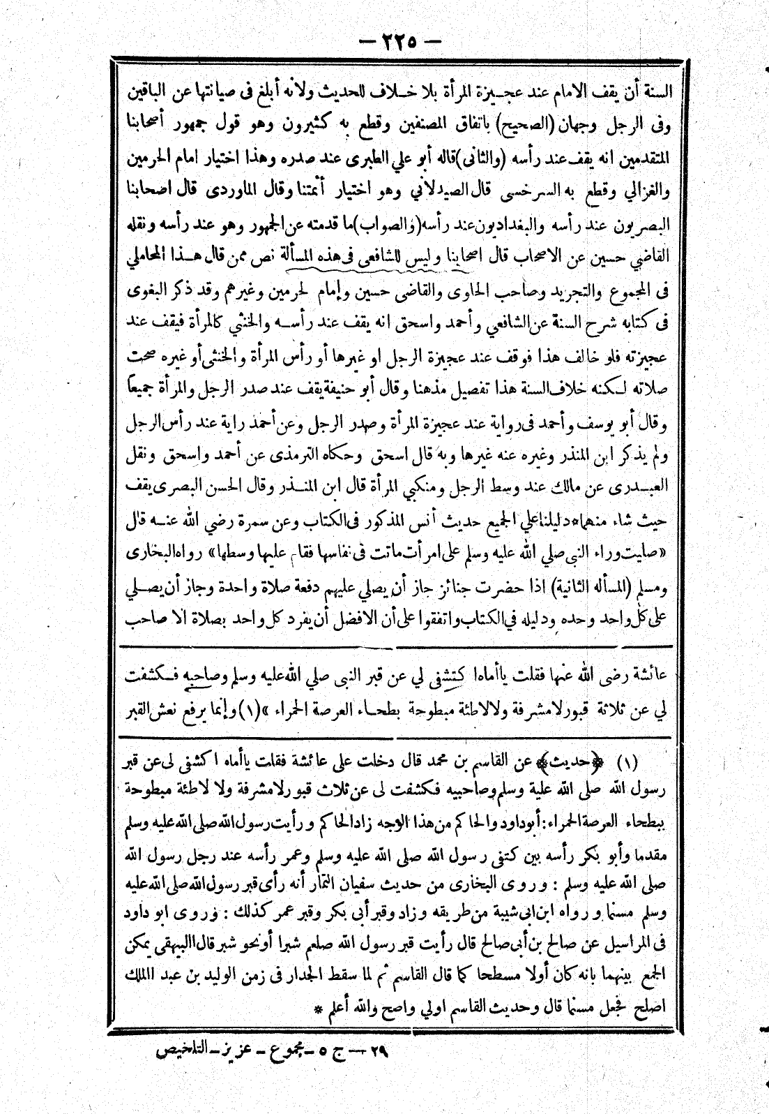 عائشة رضى الله عنها فقلت يا أماه اكتشفي لي عن قبر النبي صلي الله عليه وسلم وصاحبه فكشفت لي عن ثلاثة قبور لا مرفة ولا لاطئة مبطوحة بطحاء العرصة الحمراء) وإنما يرفع نعش القبر