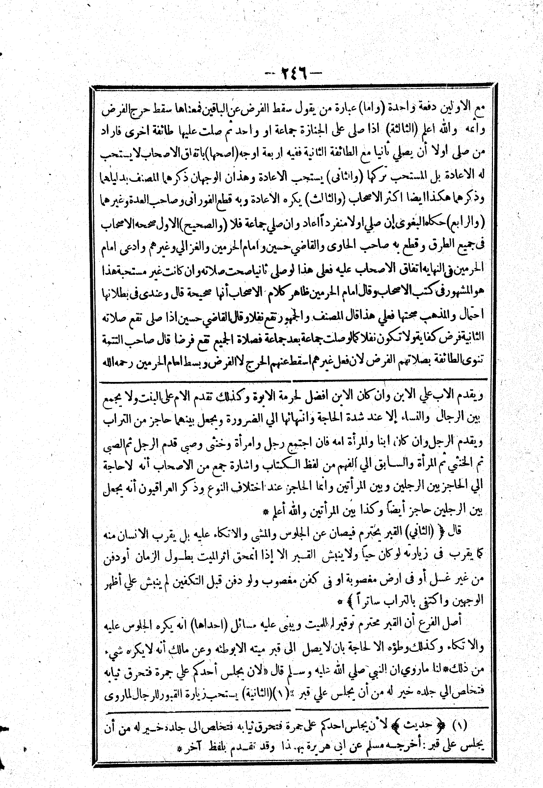 ويقدم الاب علي الابن وان كان الابن افضل لحرمة الابوة وكذلك تقدم الام على البنت ولا يجمع بين الرجال والنساء إلا عند شدة الحاجة وانتهائها الي الضرورة ويجعل بينهما حاجز من التراب ويقدم الرجل وان كان ابنا والمرأة امه فان اجتمع رجل وأمراة وخنثى وصبى قدم الرجل ثم الصبى ثم الخنثي ثم المرأة والسابق الي الفهم من لفظ الكتاب واشارة جمع من الاصحاب أنه لا حاجة الي الحاجز بين الرجلين وبين المرأتين وانما الحاجز عند اختلاف النوع وذكر العراقيون أنه يجعل بين الرجلين حاجز أيضا وكذا بين المرأتين والله أعلم * قال (الثاني) القبر يحترم فيصان عن الجلوس والمشى والاتكاء عليه بل يقرب الانسان منه كما يقرب في زيارته لو كان حيا ولا ينبش القبر الا إذا انمحق اثر الميت بطول الزمان أو دفن من غير غسل أو في ارض مغصوبة أو في كفن مغصوب ولو دفن قبل التكفين لم ينبش علي أظهر الوجهين والكتفى بالتراب ساترا) * أصل الفرع أن القبر محترم توقيرا للميت ويبنى عليه مسائل (احداها) انه يكره) الجلوس عليه والاتكاء وكذلك وطؤه الا لحاجة بان لا يصل إلى قبر ميته الا بوطئه وعن مالك أنه لا يكره شئ من ذلك * لنا ما روي ان النبي صلي الله عليه وسلم قال (لان يجلس أحد كم علي جمرة فتحرق ثيابه فتخلص الي جلده خير له من أن يجلس علي قبر) (الثانية) يستحب زيارة القبور للرجال لما روى