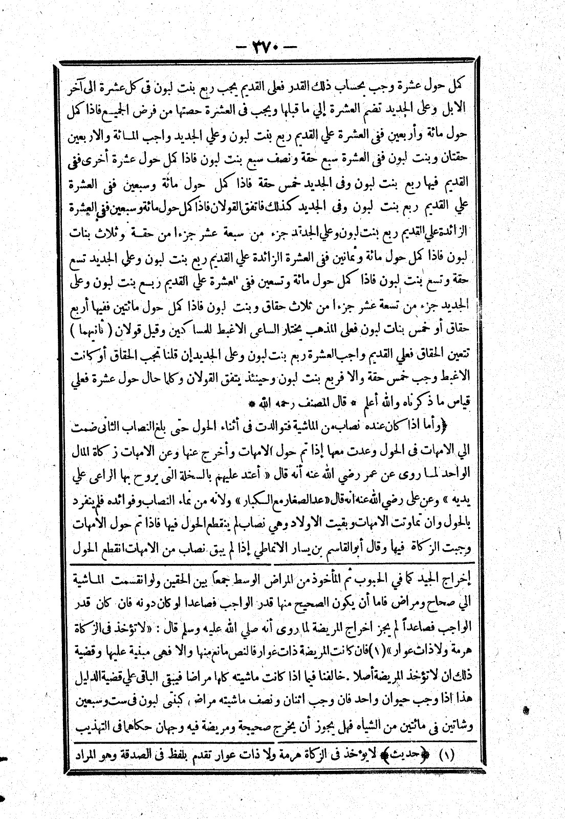 إخراج الجيد كما في الحبوب ثم المأخوذ من المراض الوسط جمعا بين الحقين ولو انقسمت الماشية الي صحاح ومراض فاما أن يكون الصحيح منها قدر الواجب فصاعدا أو كان دونه فان كان قدر الواجب فصاعدا لم يجز اخراج المريضة لما روى أنه صلي الله عليه وسلم قال: (لا تؤخذ في الزكاة هرمة ولا ذات عوار) فان كانت المريضة ذات عوار فالنص مانع منها والا فهى مبنية عليها وقضية ذلك ان لا تؤخذ المريضة أصلا.