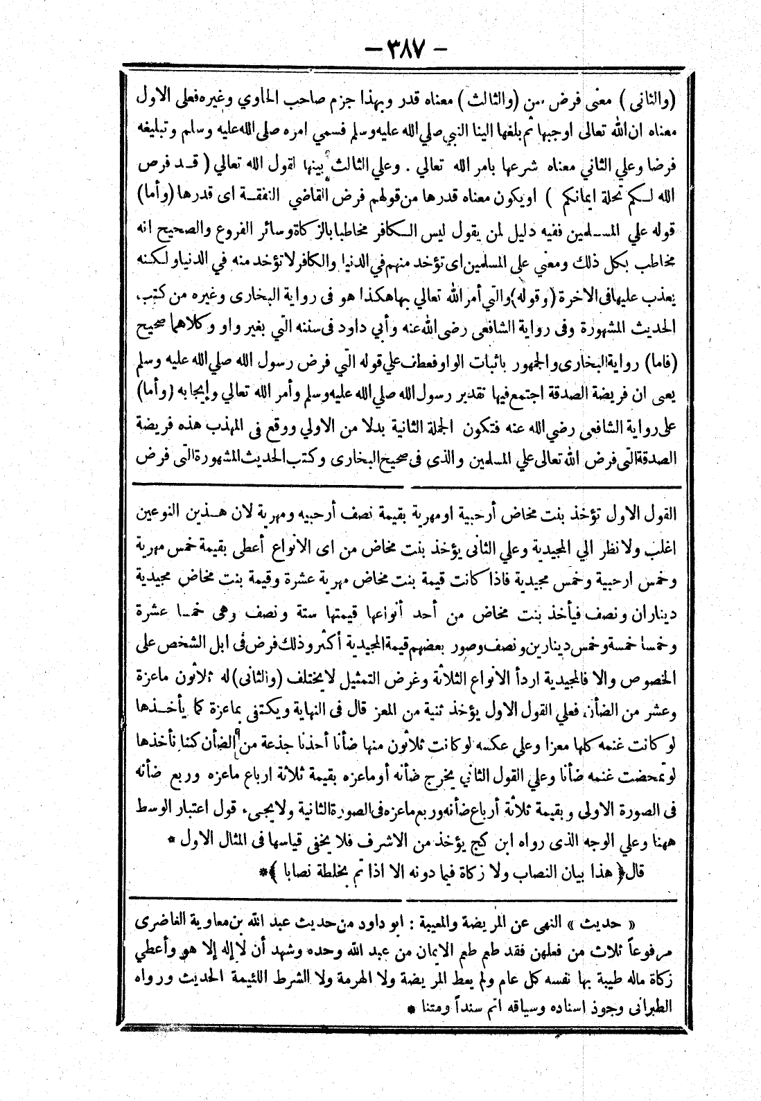 لو تمحضت غنمه ضأنا وعلي القول الثاني يخرج ضأنه أو ما عزه بقيمة ثلاثة ارباع ما عزه وربع ضانه في الصورة الاولى وبقيمة ثلاثة أرباع ضأنه وربع ما عزه في الصورة الثانية ولا يجئ قول اعتبار الوسط ههنا وعلي الوجه الذى رواه ابن كج يؤخذ من الاشرف فلا يخفى قياسها في المثال الاول * قال (هذا بيان النصاب ولا زكاة فيما دونه الا إذا تم بخلطة نصابا) *