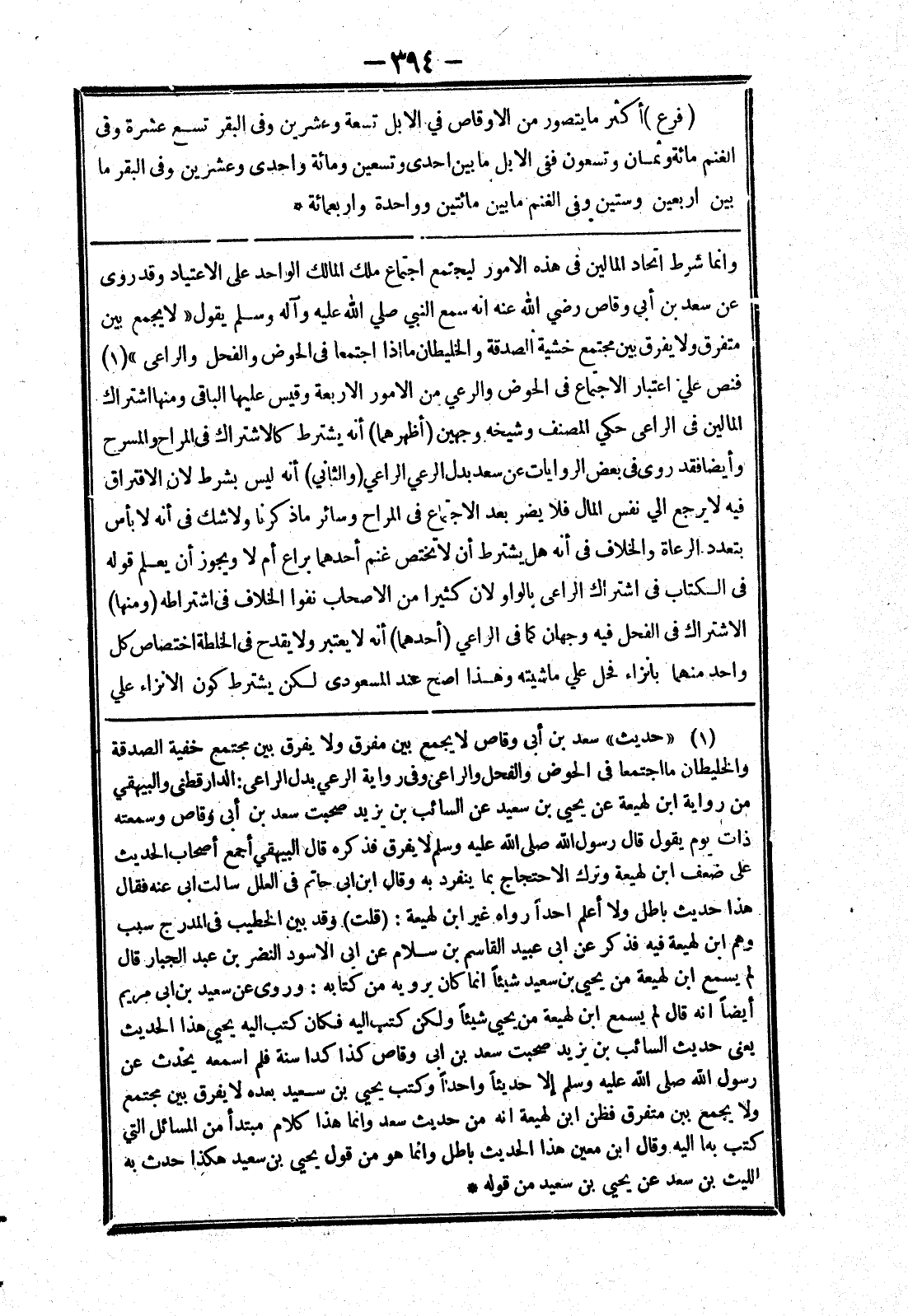 وانما شرط اتحاد المالين في هذه الامور ليجتمع اجتماع ملك المالك الواحد على الاعتياد وقد روى عن سعد بن أبى وقاص رضي الله عنه انه سمع النبي صلي الله عليه وسلم يقول (لا يجمع بين متفرق ولا يفرق بين مجمتع خشية الصدقة والخليطان ما إذا اجتمعا في الحوض والفحل والراعي) فنص علي اعتبار الاجتماع في الحوض والرعي من الامور الاربعة وقيس عليها الباقي ومنها اشتراك المالين في الراعى حكي المصنف وشيخه وجهين (أظهرهما) أنه يشترط كالاشتراك في المراح والمسرح وأيضا فقد روى في بعض الروايات عن سعد بدل الرعي الراعي (والثاني) أنه ليس بشرط لان الافتراق فيه لا يرجع الي نفس المال فلا يضر بعد الاجتماع في المراح وسائر ما ذكرنا ولا شك في أنه لا بأس بتعدد الرعاة والخلاف في أنه هل يشترط أن لا تختص غنم أحدهما براع أم لا ويجوز أن يعلم قوله في الكتاب في اشتراك الراعى بالواو لان كثيرا من الاصحاب نفوا الخلاف في اشتراطه (ومنها)
