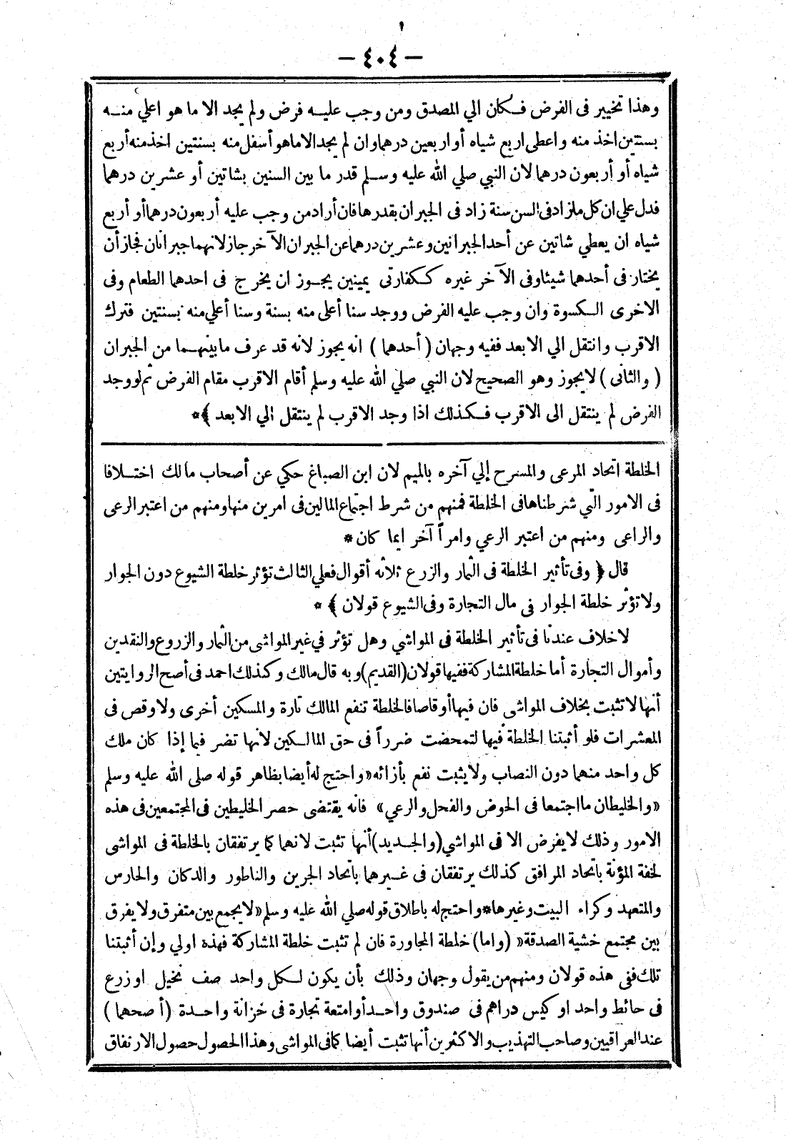 والراعي ومنهم من اعتبر الرعي وامرا آخر ايما كان * قال (وفي تأثير الخلطة في الثمار الزرع ثلاثه أقوال فعلي الثلث تؤثر خلطة الشيوع دون الجوار ولا تؤثر خلطة الجوار في مال التجارة وفي الشيوع قولان) * لا خلاف عندنا في تأثير الخطة في المواشي وهل تؤثر في غير المواشى من الثمار والزروع والنقدين وأموال التجارة أما خلطة المشاركة ففيها قولان (القديم) وبه قال مالك وكذلك احمد في أصح الروايتين أنها لا تثبت بخلاف المواشى فان فيها أو قاصا فالخلطة تنفع المالك تارة والمسكين أخرى ولا وقص في المعشرات فلو أثبتنا الخلطة فيها لتمحضت ضررا في حق المالكين لانها تضر فيما إذا كان ملك كل واحد منهما دون النصاب ولا يثبت نفع بأزائه (واحتج له أيضا بظاهر قوله صلى الله عليه وسلم (والخليطان ما اجتمعا في الحوض والفحل والرعي) فانه يقتضى حصر الخليطين في المجتمعين في هذه الامور وذلك لا يفرض الا في المواشي (والجديد) أنها تثبت لانهما كما يرتفقان بالخلطة في المواشى لخفة المؤنة باتحاد المرافق كذلك يرتفقان في غيرهما باتحاد الجرين والناطور والدكان والحارس والمتعهد وكراء البيت وغيرها * واحتج له باطلاق قوله صلي الله عليه وسلم ((لا يجمع بين متفرق ولا يفرق ببن مجتمع خشية الصدقة ((واما) خلطة المجاورة فان لم تثبت خلطة المشاركة فهذه اولي وإن أثبتنا تلك ففى هذه قولان ومنهم من يقول وجهان وذلك بأن يكون لكل واحد صف نخيل أو زرع في حائط واحد أو كيس دراهم في صندوق واحدأ وامتعة تجارة في خزانة واحدة (أصحهما) عند العراقيين وصاحب التهذيب والاكثرين أنها تثبت أيضا كما في المواشى وهذا الحصول حصول الارتفاق