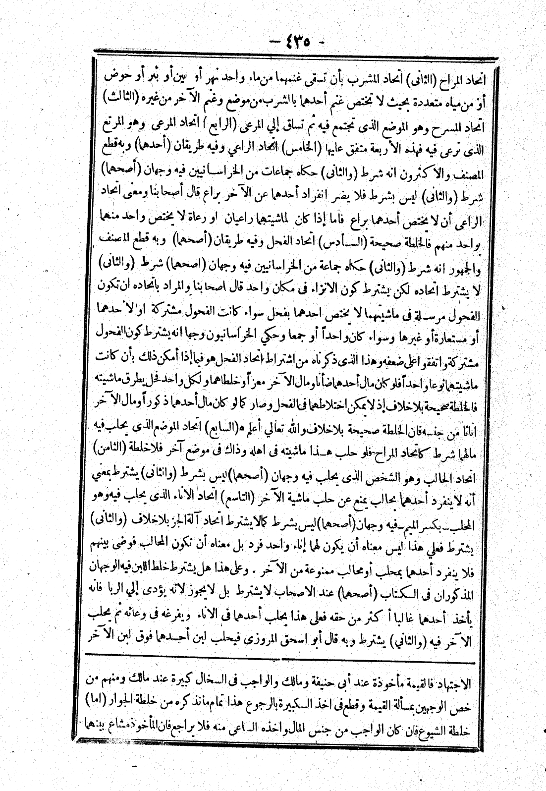 الاجتهاد فالقيمة مأخوذة عند أبى حنيفة ومالك والواجب في السخال كبيرة عند مالك ومنهم من خص الوجهين بمسألة القيمة وقطع في اخذ الكبيرة بالرجوع هذا تمام ما نذكره من خلطة الجوار (اما) خلطة الشيوع فان كان الواجب من جنس المال واخذه الساعي منه فلا يراجع فان المأخوذ مشاع بينهما