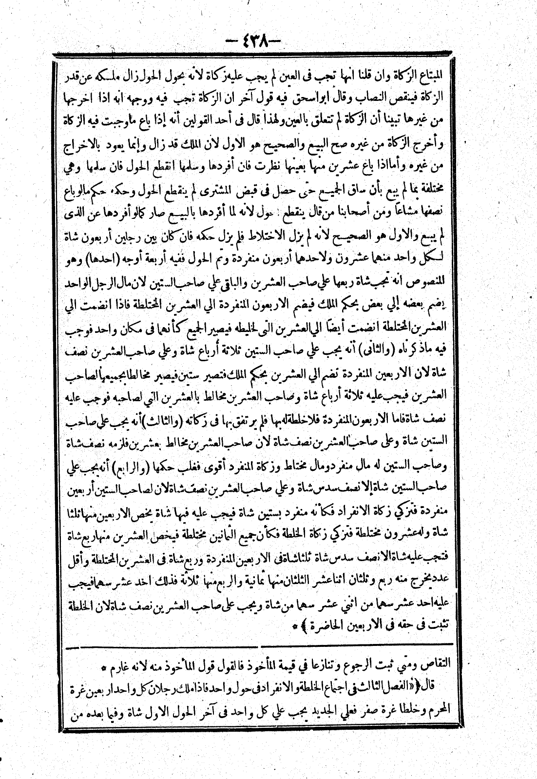 التقاص ومتي ثبت الرجوع وتنازعا في قيمة المأخوذ قول المأخوذ منه لانه غارم * قال ((الفضل الثالث في اجتماع الخلطة والانفراد في حول واحد فإذا ملك رجلان كل واحد اربعين غرة المحرم وخلطا غرة صفر فعلي الجديد يجب علي كل واحد في آخر الحول الاول شاة وفيما بعده من