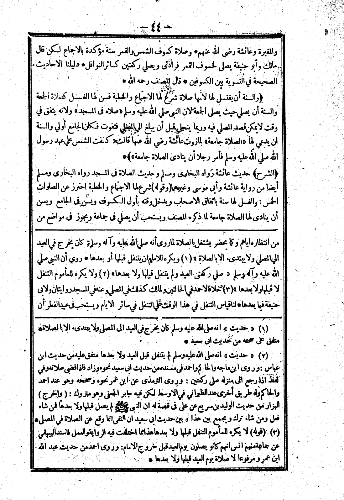 الي المصلي ولا يبتدئ الا بالصلاة) ويكره للامام ان يتنفل قبلها أو بعدها * روي أن النبي صلي الله عليه وسلم (صلي ركعتي العيد ولم يتنفل قبلها ولا بعدها) ولا يكره للمأموم التنفل لا قبلها ولا بعدها) خلافالا حمد في الحالتين ولمالك كذلك في المصلي وعنه في المسجد روايتان ولا بى حينفة فيما بعدها لنا قياس التنفل في هذا الوقت علي التنفل في سائر الايام ويستحب في عيد الفطر أن