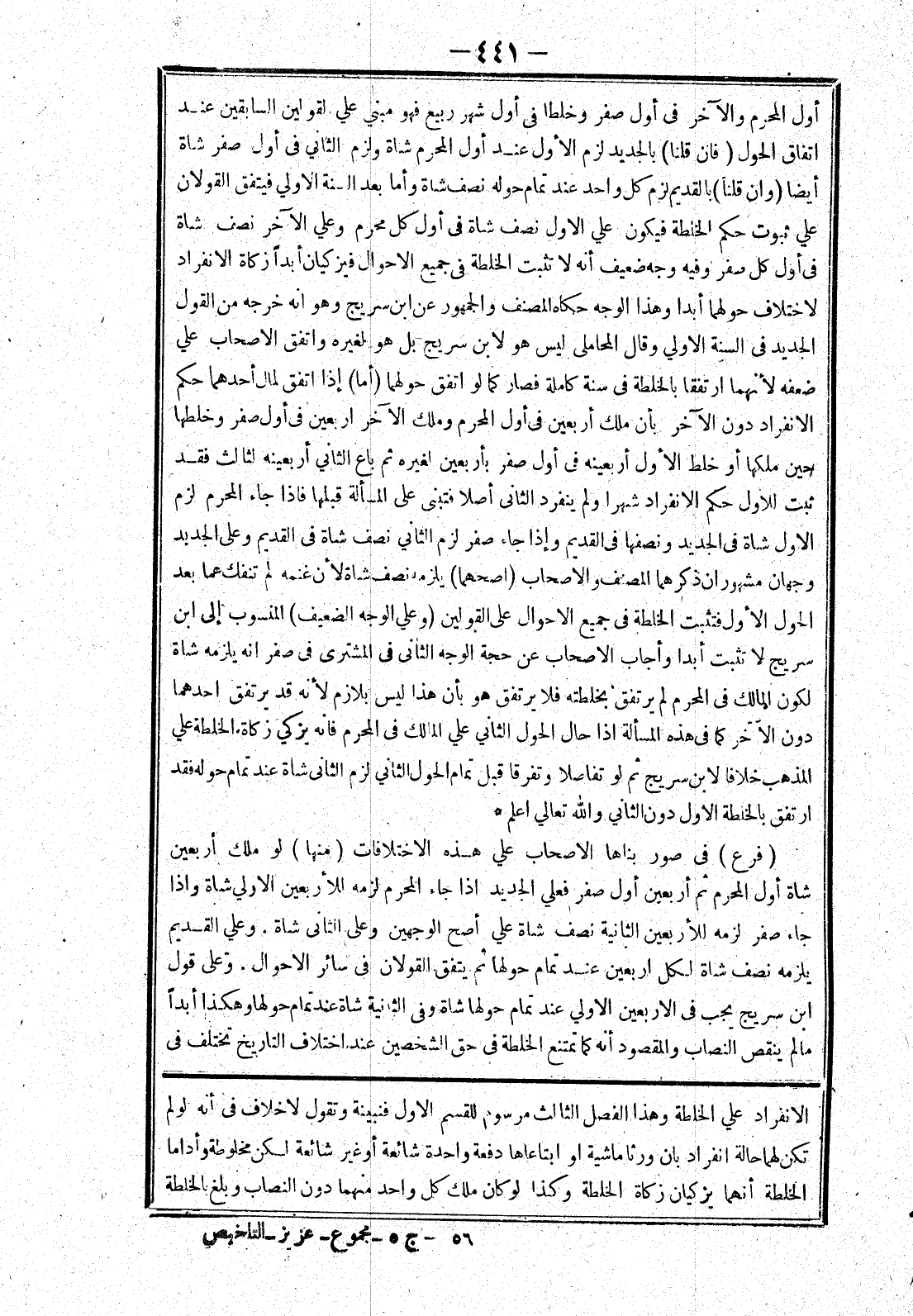 الانفراد علي الخلطة وهذا الفصل الثالث مرسوم للقسم الاول فنبينة وتقول لا خلاف في أنه لو لم تكن لهما حالة انفراد بان ورثا ماشية أو ابتاعاها دفعة واحدة شائعة أو غير شائعة لكن مخلوطة وأداما الخلطة أنهما يزكيان زكاة الخلطة وكذا لو كان ملك كل واحد منهما دون النصاب وبلغ بالخلطة