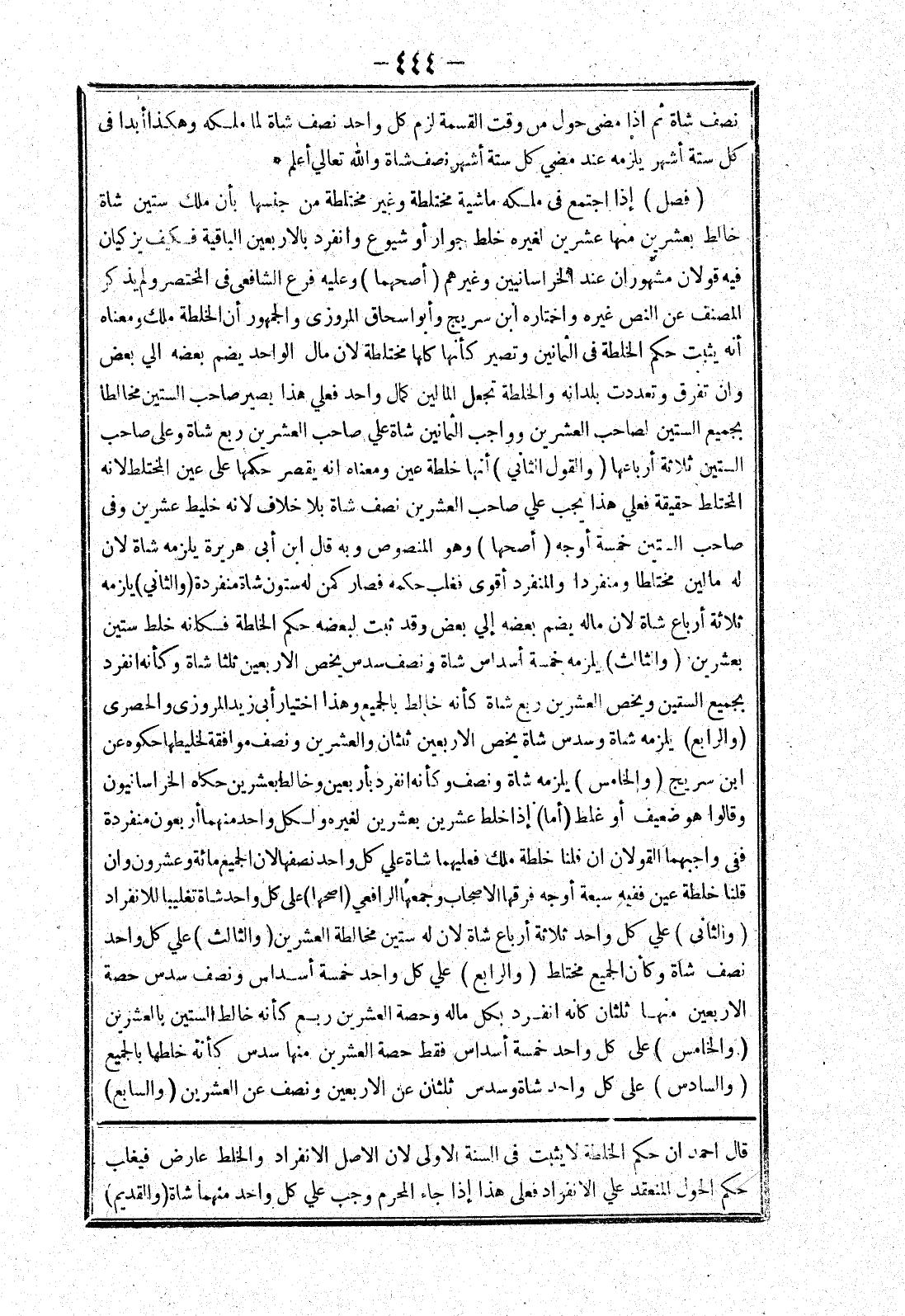 قال احمد ان حكم الخلطة لا يثبت في السنة الاولى لان الاصل الانفراد والخلط عارض فيغلب حكم الحول المنعقد علي الانفراد فعلى هذا إذا جاء المحرم وجب علي كل واحد منهما شاة (والقديم)