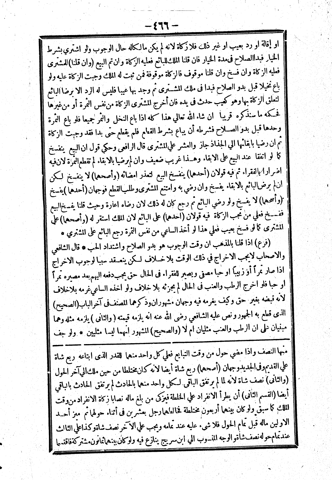 منها النصف وإذا مضي حول من وقت التبايع فعلي كل واحد منهما للقدر الذي ابتاعه ربع شاة علي القديم وفى الجديد وجهان (أصحهما) ربع شاة أيضا لانه كان مختلطا من حين ملك الي آخر الحول (والثانى) نصف شاة لانه لما لم يرتفق الباقي لكل واحد منهما بالحادث لم يرتفق الحادث بالباقي أيضا (القسم الثاني) أن يطرأ الانفراد علي الخلطة فيزيكى من بلغ ماله نصابا زكاة الانفراد من وقت الملك كما سبق ولو كان بينهما أربعون مختلطة فخالطهما رجل بعشرين في أثناء حولهما ثم ميز أحد الاولين ماله قبل تمام الحول فلا شئ عليه عند تمامه ويجب علي الآخر نصف شاة وكذا علي الثالث عند تمام حوله نصف والوجه المنسوب الي ابن سريج ينازع فيه ولو كان بينهما ثمانون مشتركة فاقتسما