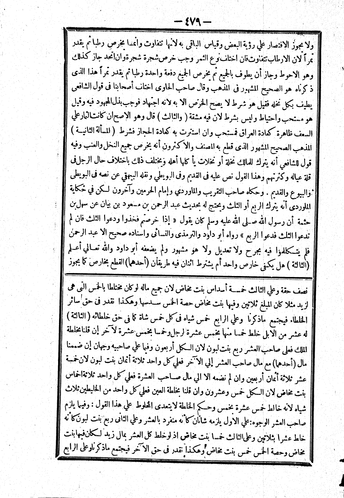 الملك فعلى صاحب العشر ربع بنتت لبون لان الكل أربعون وفيما علي صاحبيه وجهان إن ضممنا مال (أحدهما) مع مال صاحب العشر إلي الآخر فعلي كل واحد ثلاثة اثمان بنت لبون لان خمسة عشر ثلاثة أثمان أربعين وان لم نضمه الا الي مال صاحب العشرة فعلي كل واحد ثلاثة اخماس بنت مخاض لان الكل خمس وعشرون وان قلنا بخلطة العين فعلي كل واحد من الخليطين ثلاث شياه لانه خالط خمس عشرة بخمس وحكم الخلطة لا يتعدى المخلوط علي هذا القول: وفيما يلزم صاحب الشعر الوجوه: علي الاول يلزمه شاتان كأنه منفرد بالعشر وعلي الثاني ربع بنت لبون كأنه خلط عشرا بثرثين وعلى الثلث خمسا بنت مخاض إذ لو خلط كل العشر بمال زيد لكان فيها بنت مخاض وخصة الخمس خمس بنت مخاض وهكذا نقدر في حق الآخر فيجتمع ما ذكرنا وعلى الرابع
