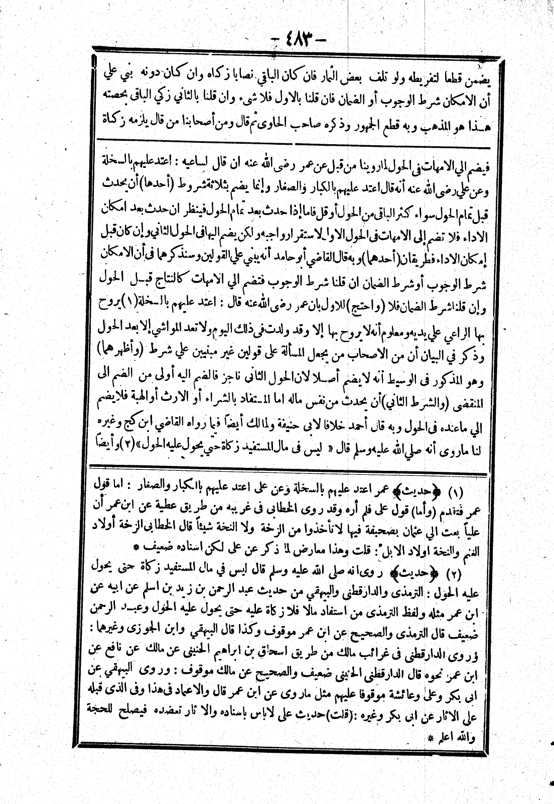 فيضم الي الامهات في الحول لما روينا من قبل عن عمر رضى الله عنه ان قال لساعيه: اعتد عليهم بالسخلة وعن علي رضى الله عنه أنه قال اعتد عليهم بالكبار والصغار وإنما يضم بثلاثة شروط (أحدها) أن يحدث قبل تمام الحول سواء كثر الباقي من الحول أو قل فاما إذا حدث بعد تمام الحول فينظر ان حدث بعد امكان الاداء فلا تضم إلى الامهات في الحول الاول لاستقرار واجبه ولكن يضم إليها في الحول الثاني إن كان قبل إمكان الاداء فطريقان (أحدهما) وبه قال القاضي أبو حامد أنه يبني علي القولين وسنذكرهما في أن الامكان شرط الوجوب أو شرط الضمان ان قلنا شرط الوجوب فتضم الي الامهات كالنتاج قبل الحول وإن قلنا شرط الضمان فلا (واحتج) للاول بان عمر رضى الله عنه قال: اعتد عليهم بالسخلة يروح بها الراعي علي يديه ومعلوم أنه لا يروح بها إلا وقد ولدت في ذلك اليوم ولا تعد المواشي إلا بعد الحول وذكر في البيان أن من الاصحاب من يجعل المسألة على قولين غير مبنيين علي شرط (وأظهرهما) وهو المذكور في الوسيط أنه لا يضم أصلا لان الحول الثاني ناجز فالضم إليه أولى من الضم إلى المنقضى (والشرط الثاني) أن يحدث من نفس ماله اما المستفاد بالشراء أو الارث أو الهبة فلا يضم إلى ما عنده في الحول وبه قال أحمد خلافا لابي حنيفة ولمالك أيضا فيما رواه القاضي ابن كج وغيره