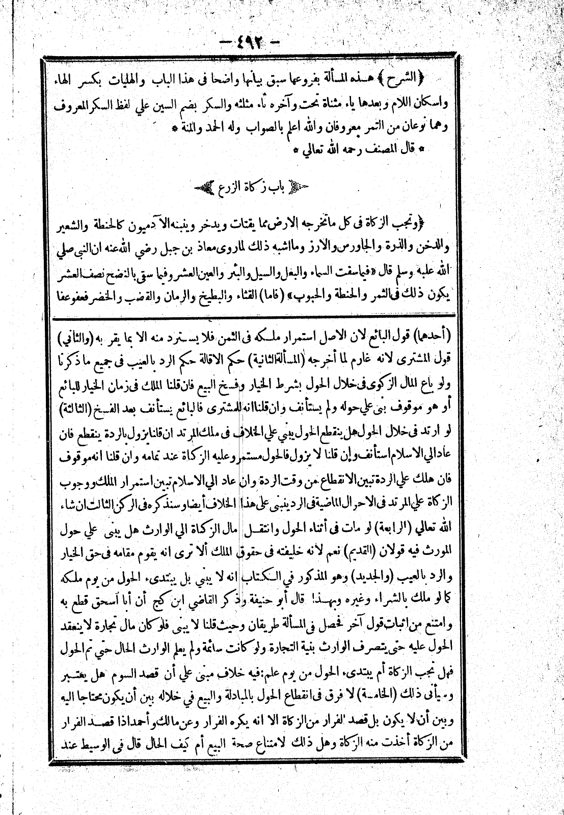 عاد الي الاسلام استأنف وإن قلنا لا يزول فالحول مستمر وعليه الزكاة عند تمامه وان قلنا انه موقوف فان هلك علي الردة تبين الانقطاع من وقت الردة وان عاد الي الاسلام تبين استمرار الملك ووجوب الزكاة علي المرتد في الاحوال الماضية في الرد ينبنى على هذا الخلاف أيضا وسنذكره في الركن الثالث ان شاء الله تعالي (الرابعة) لو مات في أثناء الحول وانتقل مال الزكاة الي الوارث هل يبنى علي حول المورث فيه قولان (القديم) نعم لانه خليفته في حقوق الملك ألا ترى انه يقوم مقامه في حق الخيار والرد بالعيب (والجديد) وهو المذكور في الكتاب انه لا يبني بل يبتدئ الحول من يوم ملكه كما لو ملك بالشراء وغيره وبهذا قال أبو حنيفة وذكر القاضي ابن كج أن أبا اسحق قطع به وامتنع من اثبات قول آخر فحصل في المسألة طريقان وحيث قلنا لا يبنى فلو كان مال تجارة لا ينعقد الحول عليه حتى يتصرف الوارث بنية التجارة ولو كانت سائمة ولم يعلم الوارث الحال حتي تم الحول فهل تجب الزكاة أم يبتدئ الحول من يوم علم: فيه خلاف مبنى علي أن قصد السوم هل يعتبر وسيأتى ذلك (الخامسة) لا فرق في انقطاع الحول بالمبادلة والبيع في خلاله بين أن يكون محتاجا إليه وبين أن لا يكون بل قصد الفرار من الزكاة الا انه يكره الفرار وعن مالك وأحمد إذا قصد الفرار من الزكاة أخذت منه الزكاة وهل ذلك لامتناع صحة البيع أم كيف الحال قال في الوسيط عند