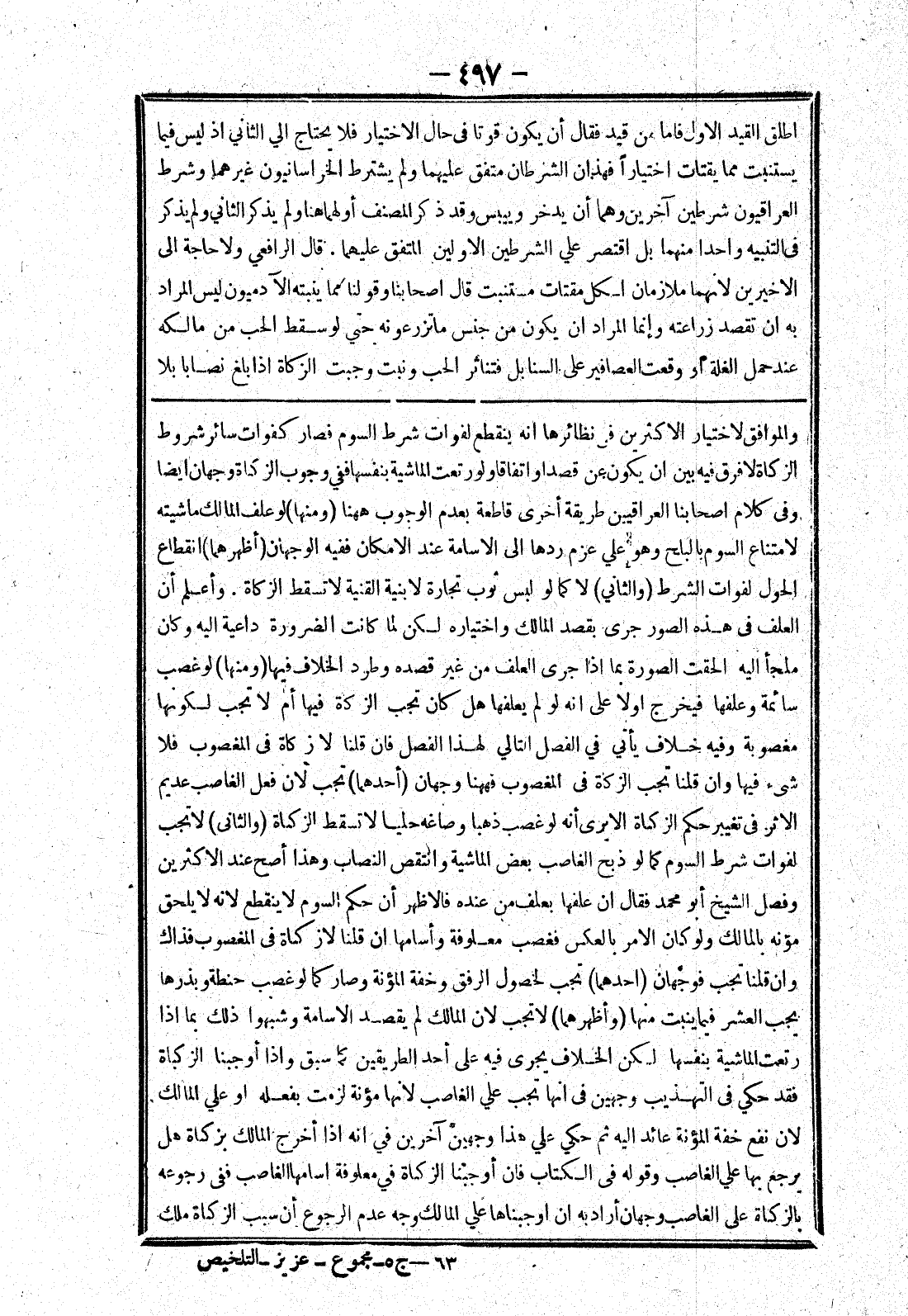 وأعلم أن العلف في هذه الصور جرى بقصد المالك واختياره لكن لما كانت الضرورة داعية إليه وكان ملجأ إليه الحقت الصورة بما إذا جرى العلف من غير قصده وطرد الخلاف فيها (ومنها) لو غصب سائمة وعلفها فيخرج اولا على انه لو لم يعلفها هل كان تجب الزكاة فيها أم لا تجب لكونها مغصوبة وفيه خلاف يأتي في الفصل التالي لهذا الفصل فان قلنا لا زكاة في المغصوب فلا شئ فيها وان قنلا تجب الزكاة في المغصوب فههنا وجهان (أحدهما) تجب لان فعل الغاصب عديم الاثر في تغيير حكم الزكاة الا يرى أنه لو غصب ذهبا وصاغه حليا لا تسقط الزكاة (والثانى) لا تجب لفوات شرط السوم كما لو ذبح الغاصب بعض الماشية وانتقص النصاب وهذا أصح عند الاكثرين وفصل الشيخ أبو محمد فقال ان علفها بعلف من عنده فالاظهر أن حكم السوم لا ينقطع لانه لا يلحق مؤنه بالمالك ولو كان الامر بالعكس فغصب معلوفة وأسامها ان قلنا لا زكاة في المغصوب فذاك وان قلنا تجب فوجهان (احدهما) تجب لخصول الرفق وخفة المؤنة وصار كما لو غصب حنطة وبذرها يجب العشر فيما ينبت منها (وأظهرهما) لا تجب لان المالك لم يقصد الاسامة وشبهوا ذلك بما إذا رتعت الماشية بنفسها لكن الخلاف يجرى فيه على أحد الطريقين كما سبق وإذا أوجبنا الزكباة فقد حكي في التهذيب وجهين في انها تجب علي الغاصب لانها مؤنة لزمت بفعله أو علي المالك لان نفع خفة المؤنة عائد إليه ثم حكي علي هذا وجهين آخرين في انه إذا أخرج المالك بزكاة هل يرجع بها علي الغاصب وقوله في الكتاب فان أوجبنا الزكاة في معلوفة اسامها الغاصب ففى رجوعه بالزكاة علي الغاصب على الغاصب وجهان أراد به ان اوجبناها علي المالك وجه عدم الرجوع أن سبب الزكاة ملك