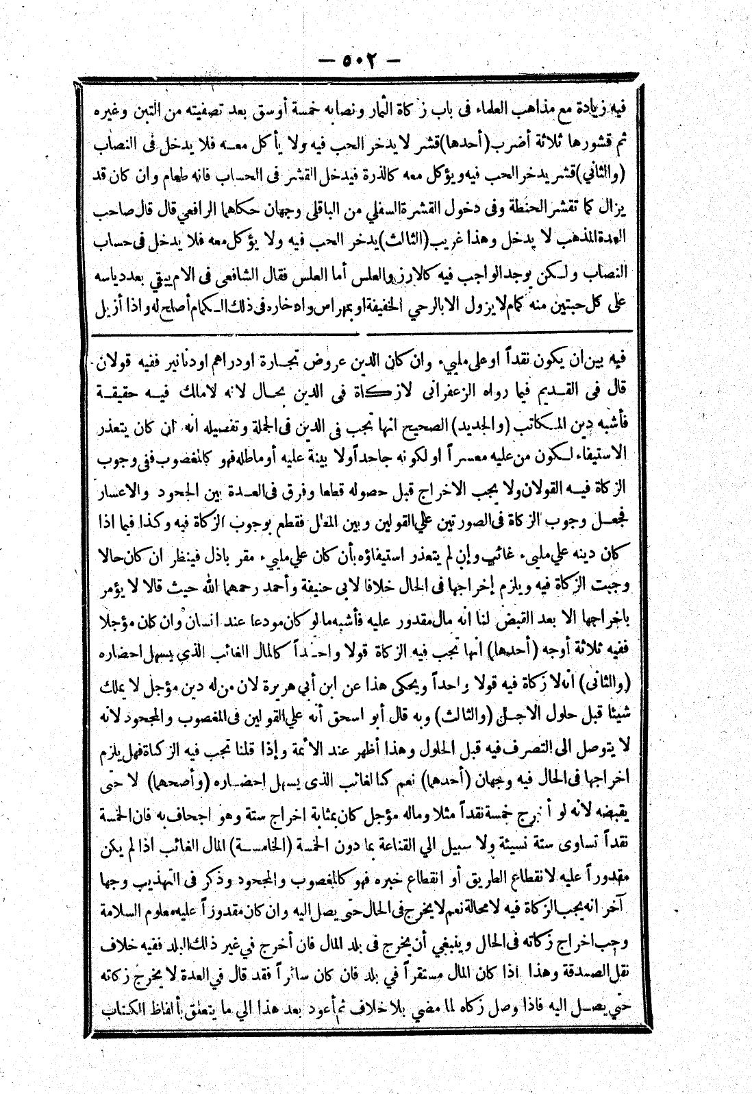 فيه بين ان يكون نقدا أو على مليئ وان كان الدين عروض تجارة أو دراهم أو دنانير ففيه قولان قال في القديم فيما رواه الزعفراني لا زكاة في الدين بحال لانه لا ملك فيه حقيقة فأشبه دين المكاتب (والجديد) الصحيح انها تجب في الدين في الجملة وتفصيله انه ان كان يتعذر الاستيفاء لكون من عليه معسرا أو لكونه جاحدا ولا بينة عليه أو ماطله فهو كالمغصوب ففى وجوب الزكاة فيه القولان ولا يجب الاخراج قبل حصوله قطعا وفرق في العدة بين الجحود والاعسار فجعل وجوب الزكاة في الصورتين علي القولين وبين المطل فقطع بوجوب الزكاة فيه وكذا فيما إذا كان دينه علي مليئ غائب وإن لم يتعذر استيفاؤه بأن كان علي مليئ مقر باذل فينظر ان كان حالا وجبت الزكاة فيه ويلزم إخراجها في الحال خلافا لا بى حنيفة وأحمد رحمهما الله حيث قالا لا يؤمر باخراجها الا بعد القبض لنا انه مال مقدور عليه فأشبه ما لو كان مودعا عند انسان وان كان مؤجلا ففيه ثلاثة أوجه (أحدها) انها تجب فيه الزكاة قولا واحدا كالمال الغائب الذى يسهل احضاره (والثانى) انه لا زكاة فيه قولا واحدا ويحكى هذا عن ابن أبي هريرة لان من له دين مؤجل لا يملك شيئا قبل حلول الاجل (والثالث) وبه قال أبو إسحق أنه علي القولين في المغصوب والمجحود لانه لا يتوصل إلى التصرف فيه قبل الحلول وهذا أظهر عند الائمة وإذا قلنا تجب فيه الزكاة فهل يلزم اخراجها في الحال فيه وجهان (أحدهما) نعم كالغائب الذى يسهل احضاره (وأصحهما) لا حتى يقبضه لانه لو أخرج خمسة نقدا مثلا وماله مؤجل كان بمثابة اخراج ستة وهو اجحاف به فان الخمسة نقدا تساوى ستة نسيئة ولا سبيل الي القناعة بما دون الخمسة (الخامسة) المال الغائب إذا لم يكن مقدورا عليه لا نقطاع الطريق أو انقطاع خبره فهو كالغصوب والمجحود وذكر في التهذيب وجها آخر انه يجب الزكاة فيه لا محالة نعم لا يخرج في الحال حتى يصل إليه وان كان مقدورا عليه معلوم السلامة وجب اخراج زكاته في الحال وينبغي أن يخرج في بلد المال فان أخرج في غير ذلك البلد ففيه خلاف نقل الصدقة وهذا إذا كان المال مستقرا في بلد فان كان سائرا فقد قال في العدة لا يخرج زكاته حتي يصل إليه فإذا وصل زكاه لما مضي بلا خلاف ثم أعود بعد هذا الي ما يتعلق بألفاظ الكتاب
