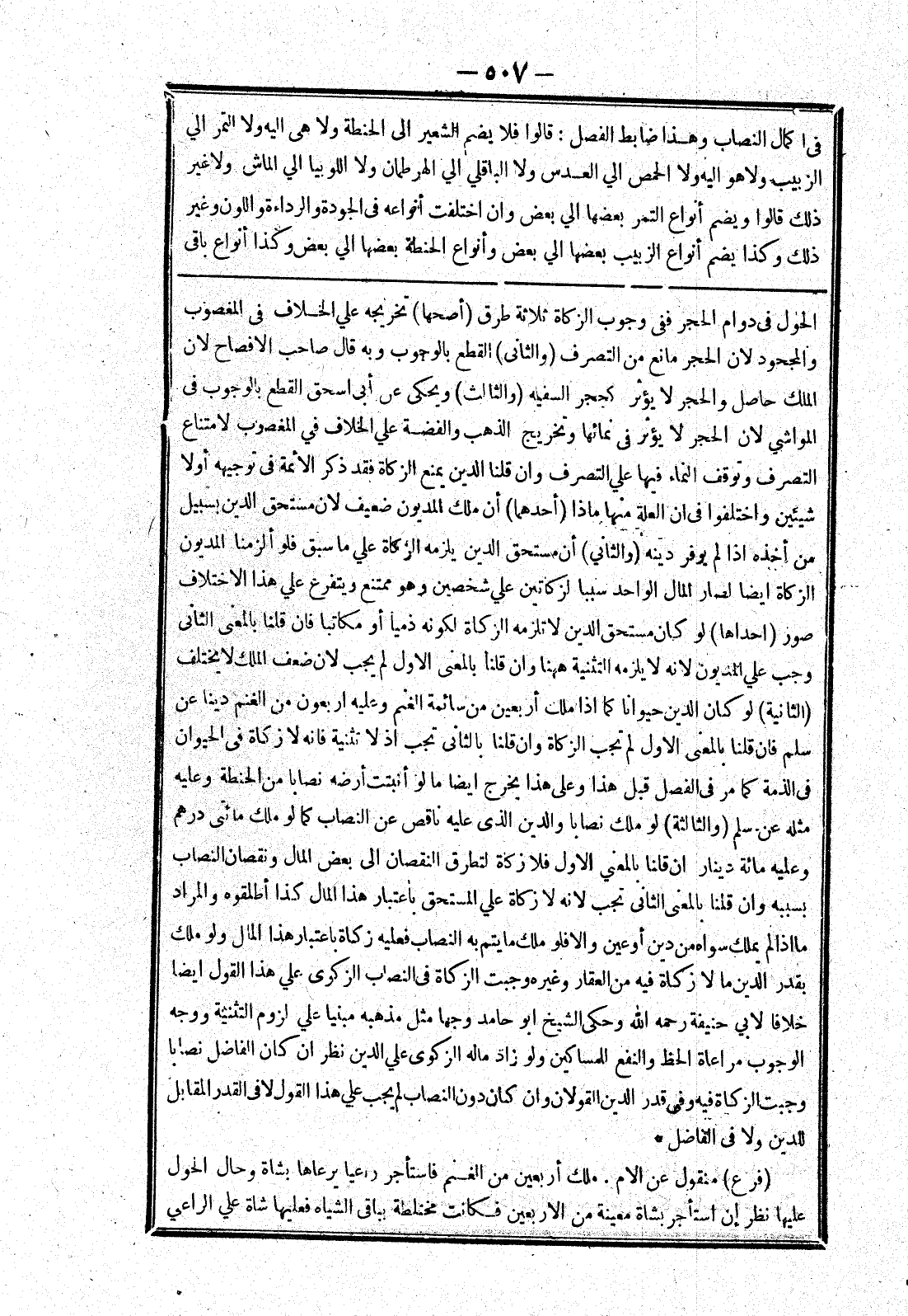 ما إذا لم يملك سواه من دين أو عين والا فلو ملك ما يتم به النصاب فعليه زكاة باعتبار هذا المال ولو ملك بقدر الدين ما لا زكاة فيه من العقار وغيره وجبت الزكاة في النصاب الزكوى علي هذا القول ايضا خلافا لا بي حنيفة رحمه الله وحكى الشيخ أبو حامد وجها مثل مذهبه مبنيا علي لزوم التثنية ووجه الوجوب مراعاة الحظ والنفع للمساكين ولو زاد ماله الزكوى علي الدين نظر ان كان الفاضل نصابا وجبت الزكاة فيه وفي قدر الدين القولان وان كان دون النصاب لم يجب علي هذا القول لا في القدر المقابل للدين ولا في الفاضل * (فرع) منقول عن الام.