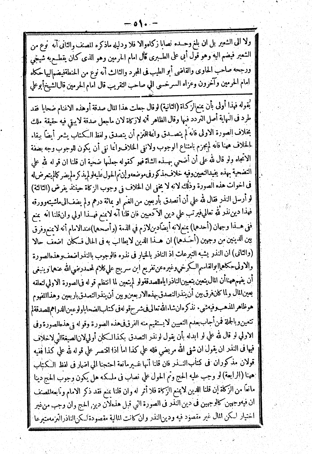 لو أرسل النذر فقال لله علي أن أتصدق بأربعين من الغنم أو بمائة درهم ولم يضف إلى ماشيته وورقه فهذا دين نذر لله تعالي فيرتب علي دين الآدميين فان قلنا أنه لا يمنع فهذا اولي وان قلنا انه يمنع ففى هذا وجهان (أحدهما) يمنع لانه أيضا دين لازم في الذمة (واصحهما) عند الامام أنه لا يمنع وفرق بين الدينين من وجهين (أحدهما) ان هذا الدين لا يطالب به في الحال فكان اضعف حالا (والثانى) ان النذر يشبه التبرعات إذا الناذر بالخيار في نذره فالوجوب بالنذر اضعف وهذه الصورة والاولى حكاهما أبو القاسم الكرخي وغيره عن تفريع ابن سريج علي كلام لحمد رضي الله عنهما وينبغى أن يفهم هنا أن المال يتعين بتعيين الناذر اياه للصدقة ولو لم يتعين لما انتظم قوله في الصورة الاولي لتعلقه بعين المال ولما كان فرق بين أن ينذر التصدق بهذه الاربعين وبين أن ينذر التصدق باربعين وهذا المفهوم هو ظاهر المذهب وفيه شئ نذكره ان شاء الله تعالى في شرح قوله في كتاب لا ضحايا ولو عين الدراهم للصدقة لم تتعين وبالجملة فمن أجاب بعدم التعيين لا يستقيم منه الفرق في هذه الصورة وقوله في هذه الصورة وفي الاولي لو قال لله علي لو ابدله بأن يقول لو نذر التصدق بكذا لكان أولي لان الصيغة التي لا خلاف فيها في النذر ان يقول ان شفى الله مريضي فلله علي كذا اما إذا اقتصر علي قو لله علي كذا ففيه قولان مذكوران في كتاب النذر فان قلنا أنها غير ملتزمة احتجنا الي اضمار في لفظ الكتاب ههنا (الرابعة) لو وجب عليه الحج وتم الحول علي نصاب في ملكه هل يكون وجوب الحج دينا مانعا من الزكاة إن قلنا الدين لا يمنع الزكاة فلا أثر له وان قلنا يمنع فقد ذكر الامام وتابعه المصنف ان فيه وجهين كالوجهين في دين النذر في الصورة التي قبل هذه لان دين الحج وان وجب من غير اختيار لكن المال غير مقصود فيه ودين النذر وان كانت المالية مقصودة لكن الناذر التزمه متبرعا