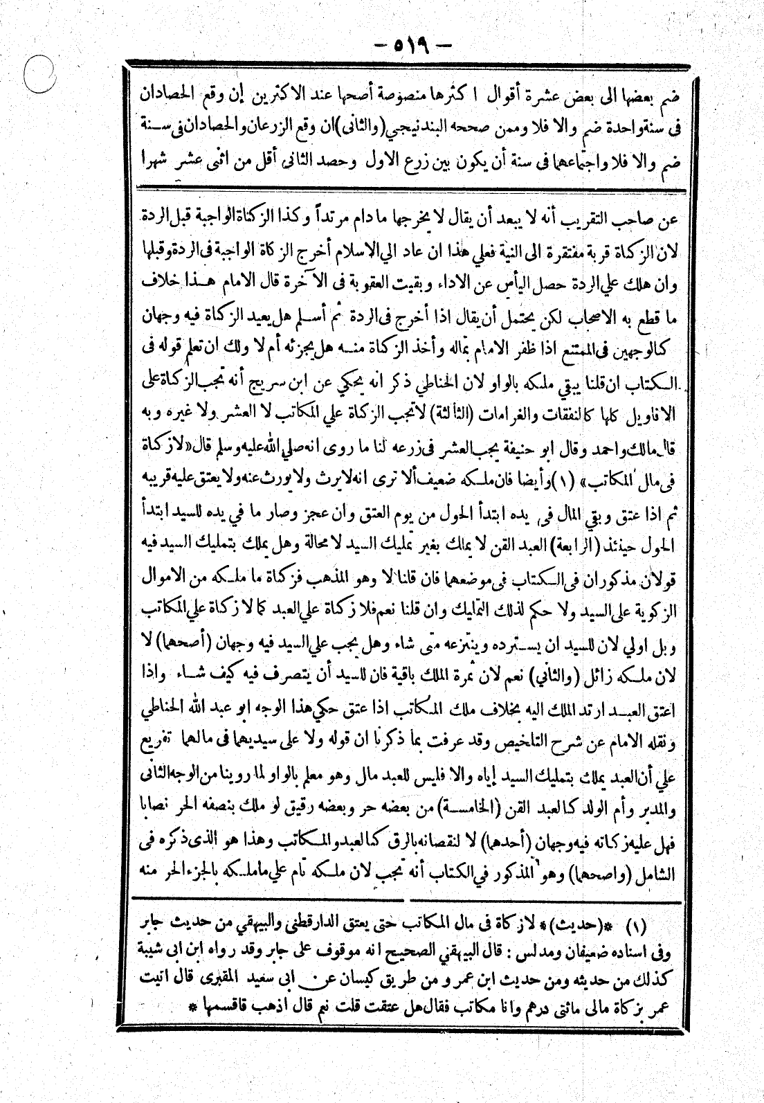 لان الزكاة قربة مفتقرة إلى النية فعلي هذا ان عاد الي الاسلام أخرج الزكاة الواجبة في الردة وقبلها وان هلك علي الردة حصل اليأس عن الاداء وبقيت العقوبة في الآخرة قال الامام هذا خلاف ما قطع به الاصحاب لكن يحتمل أن يقال إذا أخرج في الردة ثم أسلم هل يعيد الزكاة فيه وجهان كالوجهين في الممتنع إذا ظفر الامام بماله وأخذ الزكاة منه هل يجزئه أم لا ولك ان تعلم قوله في الكتاب ان قلنا يبقي ملكه بالواو لان الحناطي ذكر انه يحكي عن ابن سريج أنه تجب الزكاة على الاقاويل كلها كالنفقات والغرامات (الثالثة) لا تجب الزكاة علي المكاتب لا العشر ولا غيره وبه قال مالك واحمد وقال أبو حنيفة يجب العشر في زرعه لنا ما روى انه صلي الله عليه وسلم قال (لا زكاة في مال المكاتب) وأيضا فان ملكه ضعيف ألا ترى انه لا يرث ولا يورث عنه ولا يعتق عليه قريبه ثم إذا عتق وبقي المال في يده ابتدأ الحول من يوم العتق وان عجز وصار ما في يده للسيد ابتدأ الحول حينئذ (الرابعة) العبد القن لا يملك بغير تمليك السيد لا محالة وهل يملك بتمليك السيد فيه قولان مذكوران في الكتاب في موضعهما فان قلنا لا وهو المذهب فزكاة ما ملكه من الاموال الزكوية على السيد ولا حكم لذلك التمليك وان قلنا نعم فلا زكاة علي العبد كما لا زكاة علي المكاتب وبل اولي لان للسيد ان يسترده وينتزعه متى شاء وهل يجب علي السيد فيه وجهان (أصحهما) لا لان ملكه زائل (والثاني) نعم لان ثمرة الملك باقية فان للسيد أن يتصرف فيه كييف شاء وإذا اعتق العبد ارتد الملك إليه بخلاف ملك المكاتب إذا عتق حكي هذا الوجه أبو عبد الله الحناطي ونقله الامام عن شرح التلخيص وقد عرفت بما ذكرنا ان قوله ولا على سيديهما في مالهما تفريع علي أن العبد يملك بتمليك السيد إياه والا فليس للعبد مال وهو معلم بالواو لما روينا من الوجه الثاني والمدبر وأم الولد كالعبد القن (الخامسة) من بعضه حر وبعضه رقيق لو ملك بنصفه الحر نصابا فهل عليه زكاته فيه وجهان (أحدهما) لا لنقصانه بالرق كالعبد والمكاتب وهذا هو الذى ذكره في الشامل (واصحهما) وهو المذكور في الكتاب أنه تجب لان ملكه تام علي ما ملكه بالجزء الحر منه