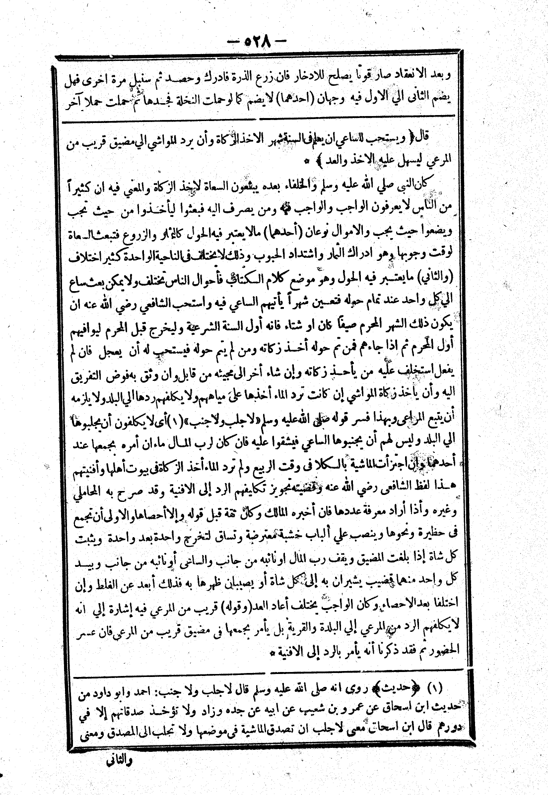 كل واحد منهما قضيب يشيران به إلى كل شاة أو يصيبان ظهرها به فذلك أبعد عن الغلط وإن اختلفا بعد الاحصاء وكان الواجب يختلف أعاد العد (وقوله) قريب من المرعي فيه إشارة إلي انه لا يكلفهم الرد من المرعي إلي البلدة والقرية بل يأمر بجمعها في مضيق قريب من المرعى فان عسر الحضور ثم فقد ذكرنا أنه يأمر بالرد إلى الافنية * (والثاني) ما يعتبر فيه الحول وهو موضع كلام الكتاب فأحوال الناس تختلف ولا يمكن بعث ساع الي كل واحد عند تمام حوله فيعين شهرا يأتيهم الساعي فيه واستحب الشافعي رضي الله عنه ان يكون ذلك الشهر المحرم صيفا كان أو شتاء فانه أول السنة الشرعية وليخرج قبل المحرم ليوافيهم أول المحرم ثم إذا جاءهم فمن تم حوله أخذ زكاته ومن لم يتم حوله فيستحب له أن يعجل فان لم يفعل استخلف عليه من يأخذ زكاته وإن شاء أخر إلى مجيئه من قابل وان وثق به فوض التفريق إليه وأن ياخذ زكاة المواشي إن كانت ترد الماء أخذها على مياههم ولا يكلفهم ردها الي البلد ولا يلزمه أن يتبع المراعى وبهذا فسر قوله صلى الله عليه وسلم (لا جلب لا جنب) أي لا يكلفون أن يجلبوها الي البلد وليس لهم أن يجنبوها الساعي فيشقوا عليه فان كان لرب المال ماء ان أمره بجمعها عند أحدهما وان اجتزأت الماشية بالكلا في وقت الربيع ولم ترد الماء أخذ الزكاة في بيوت أهلها وأفنيتهم هذا لفظ الشافعي رضي الله عنه وقضيته تجويز تكليفهم الرد إلى الافنية وقد صرح به المحاملي وغيره وأذا أراد معرفة عددها فان أخبره المالك وكان ثقة قبل قوله وإلا أحصاها والاولى أن تجمع في حظيرة ونحوها وينصب علي ألباب خشبة معترضة وتساق لتخرج واحدة بعد واحدة ويثبت كل شاة إذا بلغت المضيق ويقف رب المال أو نائبه من جانب والساعى أو نائبه من جانب وبيد كل واحد منهما قضيب يشيران به إلى كل شاة أو يصيبان ظهرها به فذلك أبعد عن الغلط وإن اختلفا بعد الاحصاء وكان الواجب يختلف أعاد العد (وقوله) قريب من المرعي فيه إشارة إلي انه لا يكلفهم الرد من المرعي إلي البلدة والقرية بل يأمر بجمعها في مضيق قريب من المرعى فان عسر الحضور ثم فقد ذكرنا أنه يأمر بالرد إلى الافنية *
