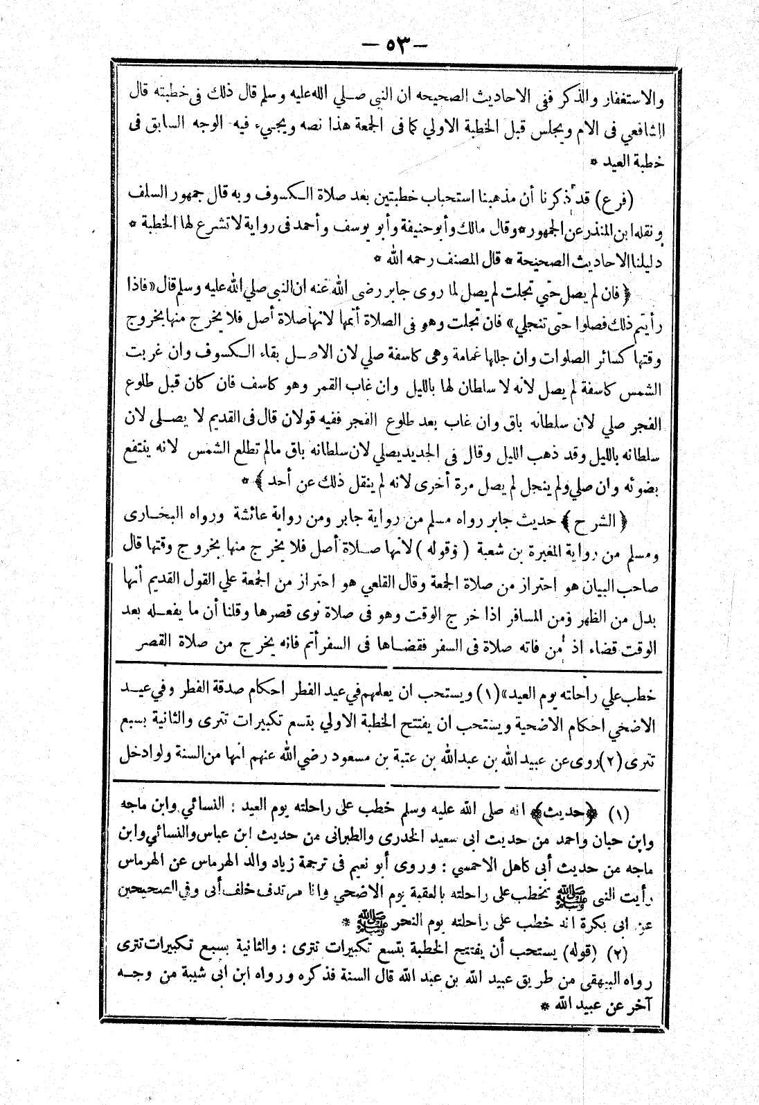 خطب علي راحلته يوم العيد) ويستحب ان يعلمهم في عيد الفطر احكام صدقة الفطر وفي عيد الاضحى احكام الاضحية ويستحب ان يفتتح الخطبة الاولي بتسع تكبيرات تترى والثانية بسبع تترى روى عن عبيد الله بن عبد الله بن عتبة بن مسعود رضي الله عنهم انها من السنة ولو ادخل