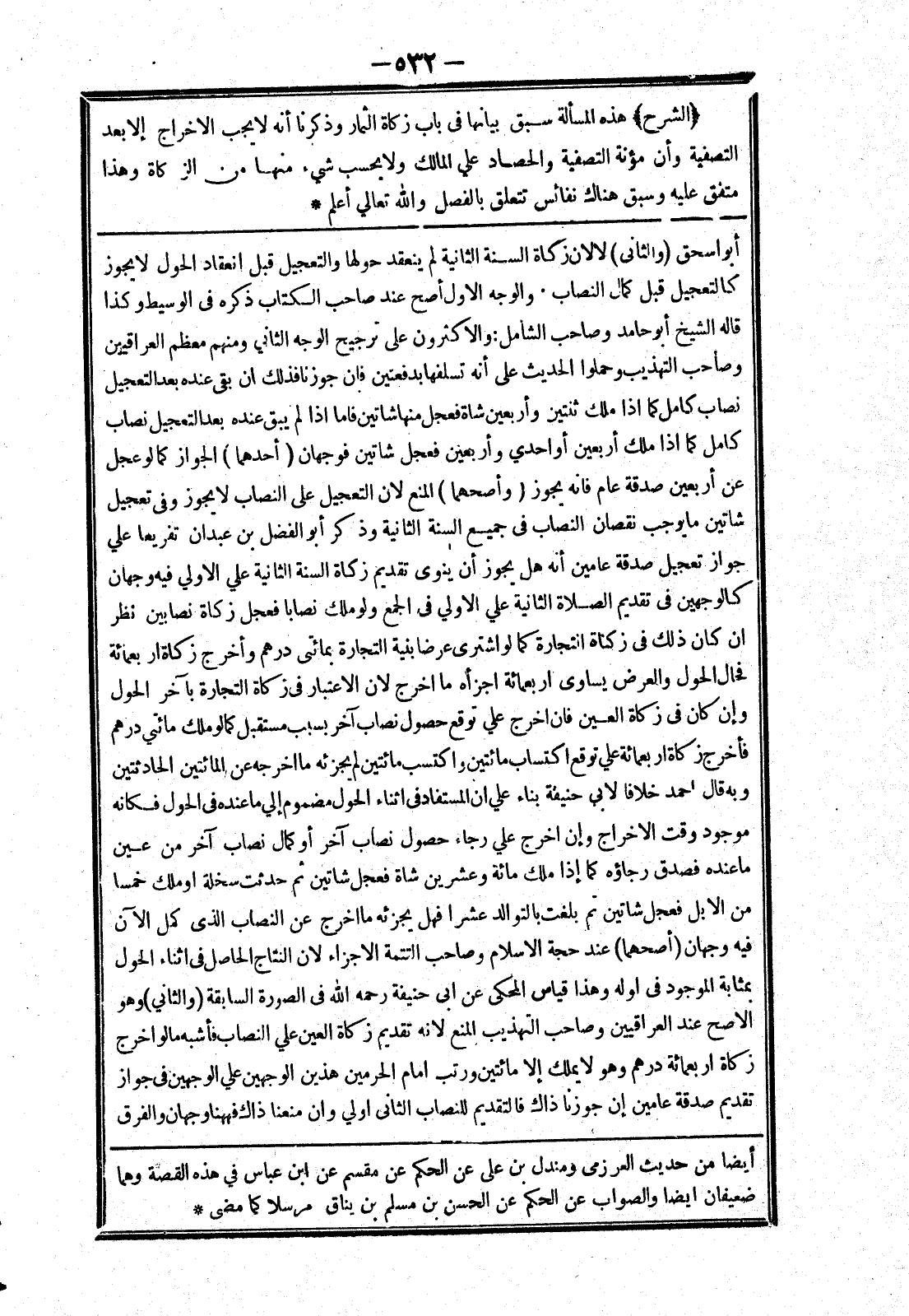 والوجه الاول أصح عند صاحب الكتاب ذكره في الوسيط وكذا قاله الشيخ أبو حامد وصاحب الشامل: والا كثرون على ترجيح الوجه الثاني ومنهم معظم العراقيين وصاحب التهذيب وحملوا الحديث على أنه تسلفها بدفعتين فان جوزنا فذلك ان بقى عنده بعد التعجيل نصاب كامل كما إذا ملك ثنتين وأربعين شاة فعجل منها شاتين فاما إذا لم يبق عنده بعد التعجيل نصاب كامل كما إذا ملك أربعين أو احدي وأربعين فعجل شاتين فوجهان (أحدهما) الجواز كما لو عجل عن أربعين صدقة عام فانه يجوز (وأصحهما) المنع لان التعجيل على النصاب لا يجوز وفي تعجيل شاتين ما يوجب نقصان النصاب في جميع السنة الثانية وذكر أبو الفضل بن عبد ان تفريعا علي جواز تعجيل صدقة عامين أنه هل يجوز أن ينوى تقديم زكاة السنة الثانية علي الاولي فيه وجهان كالوجهين في تقديم الصلاة الثانية علي الاولي في الجمع ولو ملك نصابا فعجل زكاة نصابين نظر ان كان ذلك في زكاة التجارة كما لو اشترى عرضا بنية التجارة بمائتي درهم وأخرج زكاة اربعمائة فحال الحول والعرض يساوى اربعمائة اجزأه ما اخرج لان الاعتبار في زكاة التجارة بآخر الحول وإن كان في زكاة العين فان اخرج علي توقع حصول نصاب آخر بسبب مستقبل كما لو ملك مائتي درهم فأخرج زكاة اربعمائة علي توقع الكتساب مائتين واكتسب مائتين لم يجزئه ما اخرجه عن المائتين الحادثتين