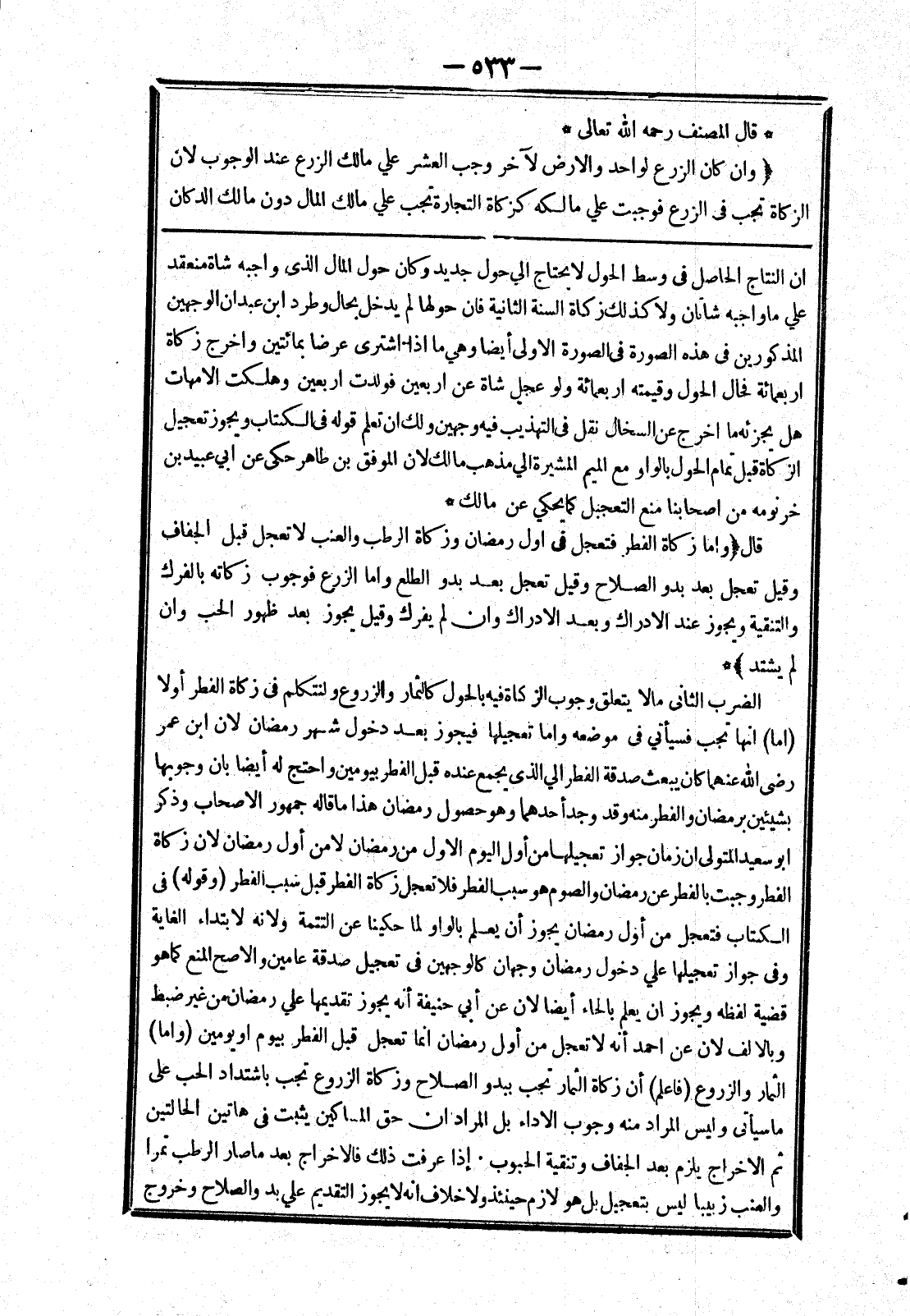 (اما) انها تجب فسيأتي في موضعه واما تعجيلها فيجوز بعد دخول شهر رمضان لان ابن عمر رضى الله عنهما كان يبعث صدقة الفطر الي الذى يجمع عنده قبل الفطر بيومين واحتج له أيضا بان وجوبها بشيئين برمضان والفطر منه وقد وجد أحدهما وهو حصول رمضان هذا ما قاله جمهور الاصحاب وذكر ابو سعيد المتولي ان زمان جواز تعجيلها من أول اليوم الاول من رمضان لا من أول رمضان لان زكاة الفطر وجبت بالفطر عن رمضان والصوم هو سبب الفطر فلا تعجل زكاة الفطر قبل سبب الفطر (وقوله) في الكتاب فتعجل من أول رمضان يجوز أن يعلم بالواو لما حكينا عن التتمة ولانه لابتداء الغاية وفي جواز تعجيلها علي دخول رمضان وجهان كالوجهين في تعجيل صدقة عامين والاصح المنع كما هو قضية لفظه ويجوز ان يعلم بالحاء أيضا لان عن أبي حنيفة أنه يجوز تقديمها علي رمضان من غير ضبط وبالالف لان عن احمد أنه لا تعجل من أول رمضان انما تعجل قبل الفطر بيوم أو يومين (واما) الثمار والزروع (فاعلم) أن زكاة الثمار تجب ببدو الصلاح وزكاة الزروع تجب باشتداد الحب على ما سيأتي وليس المراد منه وجوب الاداء بل المراد ان حق المساكين يثبت في هاتين الحالتين ثم الاخراج يلزم بعد الجفاف وتنقية الحبوب.