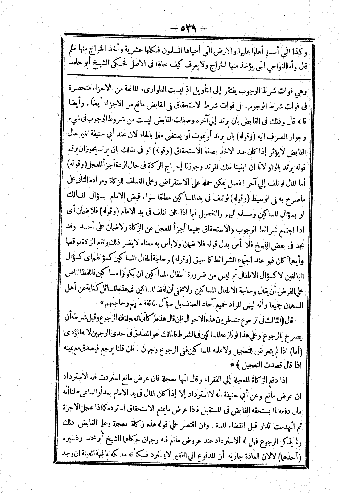 وأيضا فانه قال وذلك في القابض بان يرتد إلي آخره وصفات القابض ليست من شروط الوجوب في شئ وجواز الصرف إليه (وقوله) بان يرتد أو يموت أو يستغنى معلم بالحاء لان عند أبي حنيفة تغير حال القابض لا يؤثر إذا كان عند الاخذ بصفة الاستحقاق (وقوله) أو في المالك بان يرتد يجوز ان يرقم قوله يرتد بالواو لانا ان ابقينا ملك المرتد وجوزنا إخراج الزكاة في حال الردة أجزأ المعجل (وقوله) أما المال لو تلف إلي آخر الفصل يمكن حمله على الاستقراض وعلى التسلف للزكاة ومراده الثاني على ما صرح به في الوسيط (وقوله) لو تلف في يد المساكين مطلقا سواء قبض الامام بسؤال المالك أو بسؤال المساكين وسلمه إليهم والتفصيل فيما إذا كان التلف في يد الامام (وقوله) فلا ضمان أي إذا اجتمع شرائط الوجوب والاستحقاق جميعا أجزأ المعجل عن الزكاة ولا ضمان على أحد وقد