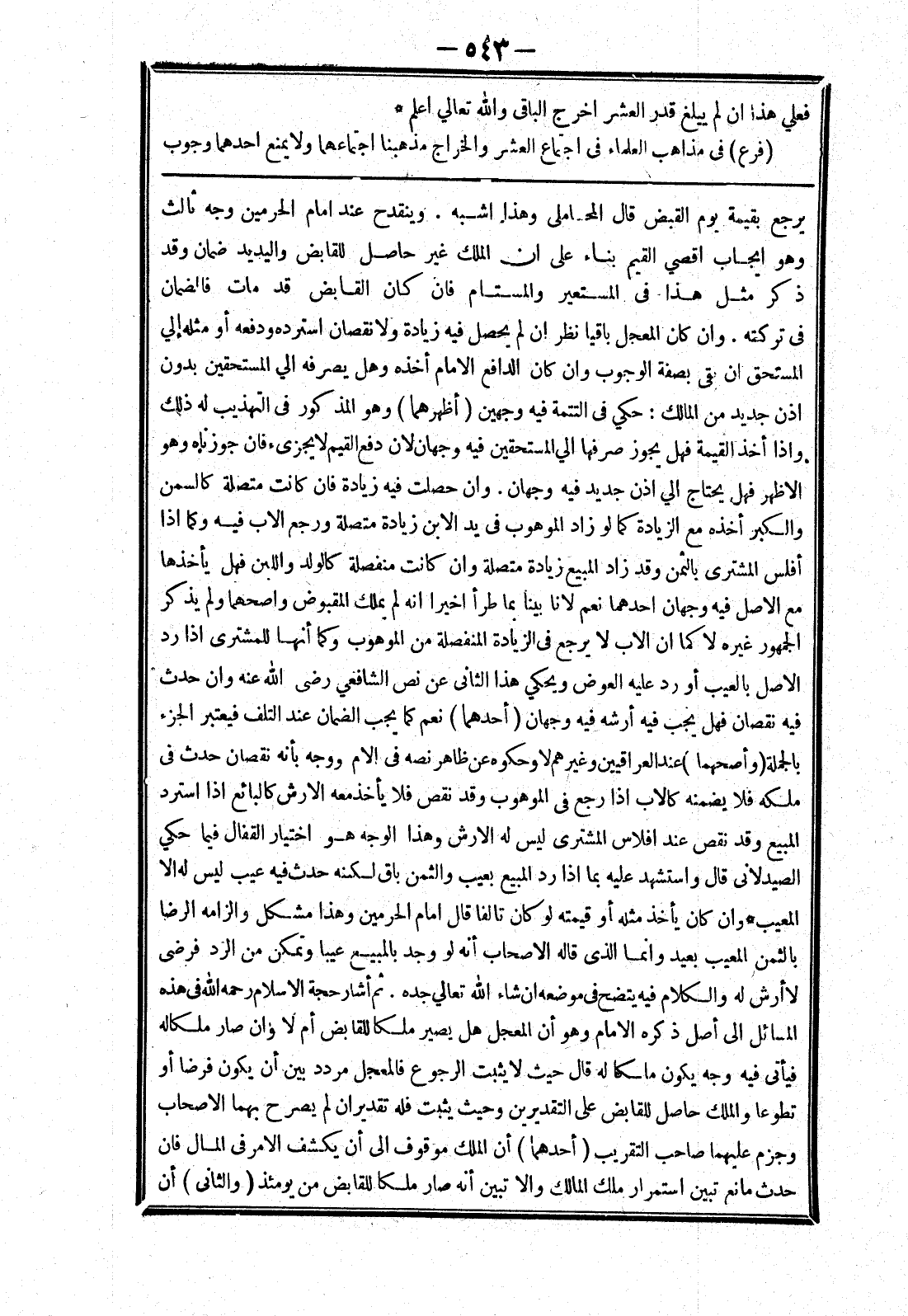 فيه نقصان فهل يجب فيه أرشه فيه وجهان (أحدهما) نعم كما يجب الضمان عند التلف فيعتبر الجزء بالجملة (وأصحهما) عند العراقيين وغيرهم لا وحكوه عن ظاهر نصه في الام ووجه بأنه نقصان حدث في ملكه فلا يضمنه كالاب إذا رجع في الموهوب وقد نقص فلا يأخذ معه الارش كالبائع إذا استرد المبيع وقد نقص عند افلاس المشترى ليس له الارش وهذا الوجه هو اختيار القفال فيما حكي الصيدلانى قال واستشهد عليه بما إذا رد المبيع بعيب والثمن باق لكنه حدث فيه عيب ليس له الا المعيب وان كان يأخذ مثله أو قيمته لو كان تالفا قال امام الحرمين وهذا مشكل والزامه الرضا بالثمن المعيب بعيد وانما الذى قاله الاصحاب أنه لو وجد بالمبيع عيبا وتمكن من الرد فرضى لا أرش له والكلام فيه يتضح في موضعه ان شاء الله تعالي جده.
