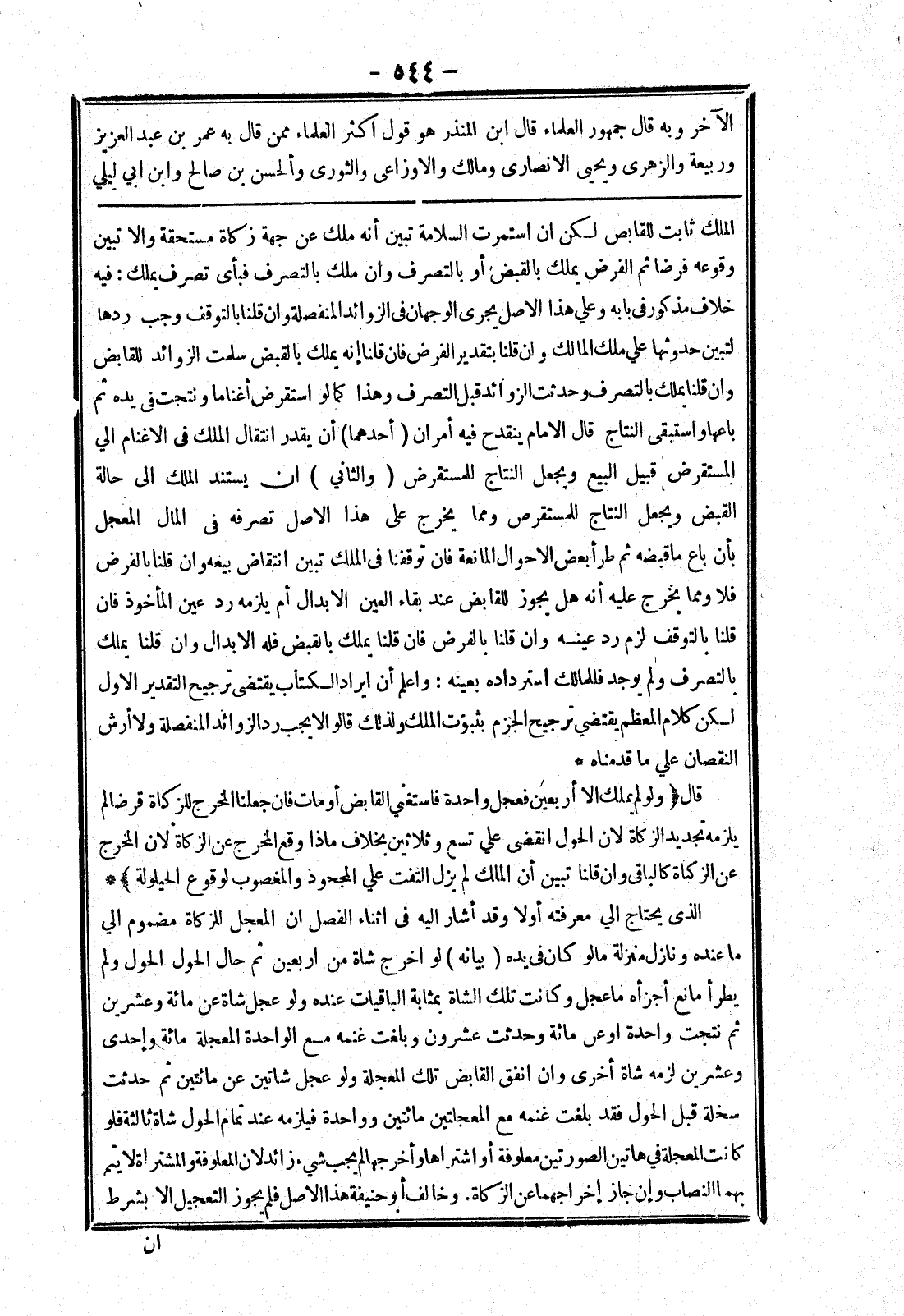 بأن باع ما قبضه ثم طرأ بعض الاحوال المانعة فان توقفنا في الملك تبين انتقاض بيعه وان قلنا بالفرض فلا ومما يخرج عليه أنه هل يجوز للقابض عند بقاء العين الابدال أم يلزمه رد عين المأخوذ فان قلنا بالتوقف لزم رد عينه وان قلنا بالفرض فان قلنا يملك بالقبض فله الابدال وان قلنا يملك بالتصرف ولم يوجد فللمالك استرداده بعينه: واعلم أن ايراد الكتاب يقتضى ترجيح التقدير الاول لكن كلام المعظم يقتضي ترجيح الجزم بثبوت الملك ولذلك قالوا لا يجب رد الزوائد المنفصلة ولا أرش النقصان علي ما قدمناه * قال (ولو لم يملك الا أربعين فعجل واحدة فاستغني القابض أو مات فان جعلنا المخرج للزكاة قرضا لم يلزمه تجديد الزكاة لان الحول انقضى علي تسع وثلاثين بخلاف ماذا وقع المخرج عن الزكاة لان المخرج عن الزكاة لان الحول انقضى علي ستع وثلاثين بخلاف ماذا وقع المخرج عن الزكاة لان المخرج عن الزكاة كالباقي وان قلنا تبين أن الملك لم يزل التفت علي المجحود والمغصوب لوقوع الحيلولة) * الذى يحتاج الي معرفته أولا وقد أشار إليه في اثناء الفصل ان المعجل للزكاة مضموم الي ما عنده ونازل منزلة ما لو كان في يده (بيانه) لو اخرج شاة من اربعين ثم حال الحول الحول ولم يطرأ مانع أجزأه ما عجل وكانت تلك الشاة بمثابة الباقيات عنده ولو عجل شاة عن مائة وعشرين ثم نتجت واحدة أو عن مائة وحدثت عشرون وبلغت غنمه مع الواحدة المعجة مائة وإحدى وعشرين لزمه شاة أخرى وان انفق القابض تلك المعجلة ولو عجل شاتين عن مائتين ثم حدثت سخلة قبل الحول فقد بلغت غنمه مع المعجلتين مائتين وواحدة فيلزمه عند تمام الحول شاة ثالثة فلو كانت المعجلة في هاتين الصورتين معلوفة أو اشتراها وأخرجها لم يجب شئ زائد لان المعلوفة والمشتراة لا يتم بهما النصاب وإن جاز إخراجهما عن الزكاة.