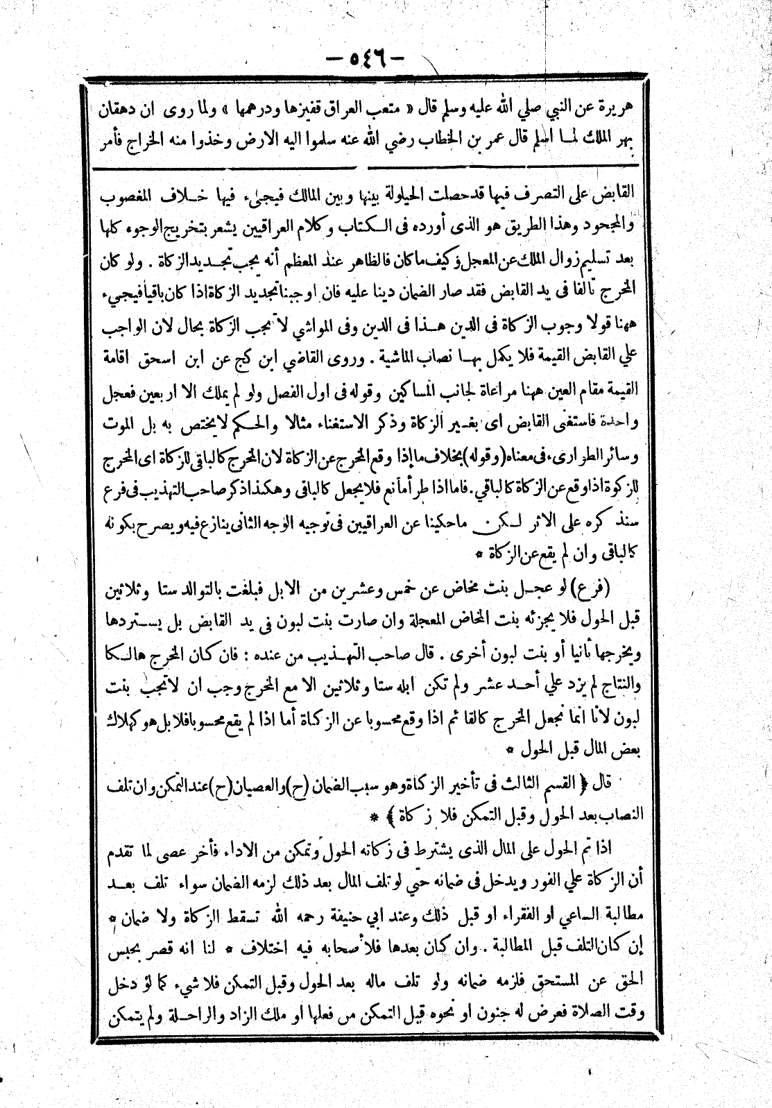 قال صاحب التهذيب من عنده: فان كان المخرج هالكا والنتاج لم يزد علي أحد عشر ولم تكن ابله ستا وثلاثين الا مع المخرج وجب ان لا تجب بنت لبون لانا انما نجعل المخرج كالقائم إذا وقع محسوبا عن الزكاة أما إذا لم يقع محسوبا فلا بل هو كهلاك بعض المال قبل الحول * قال (القسم الثالث في تأخير الزكاة وهو سبب الضمان (ح) والعصيان (ح) عند التمكن وان تلف النصاب بعد الحول وقبل التمكن فلا زكاة) *