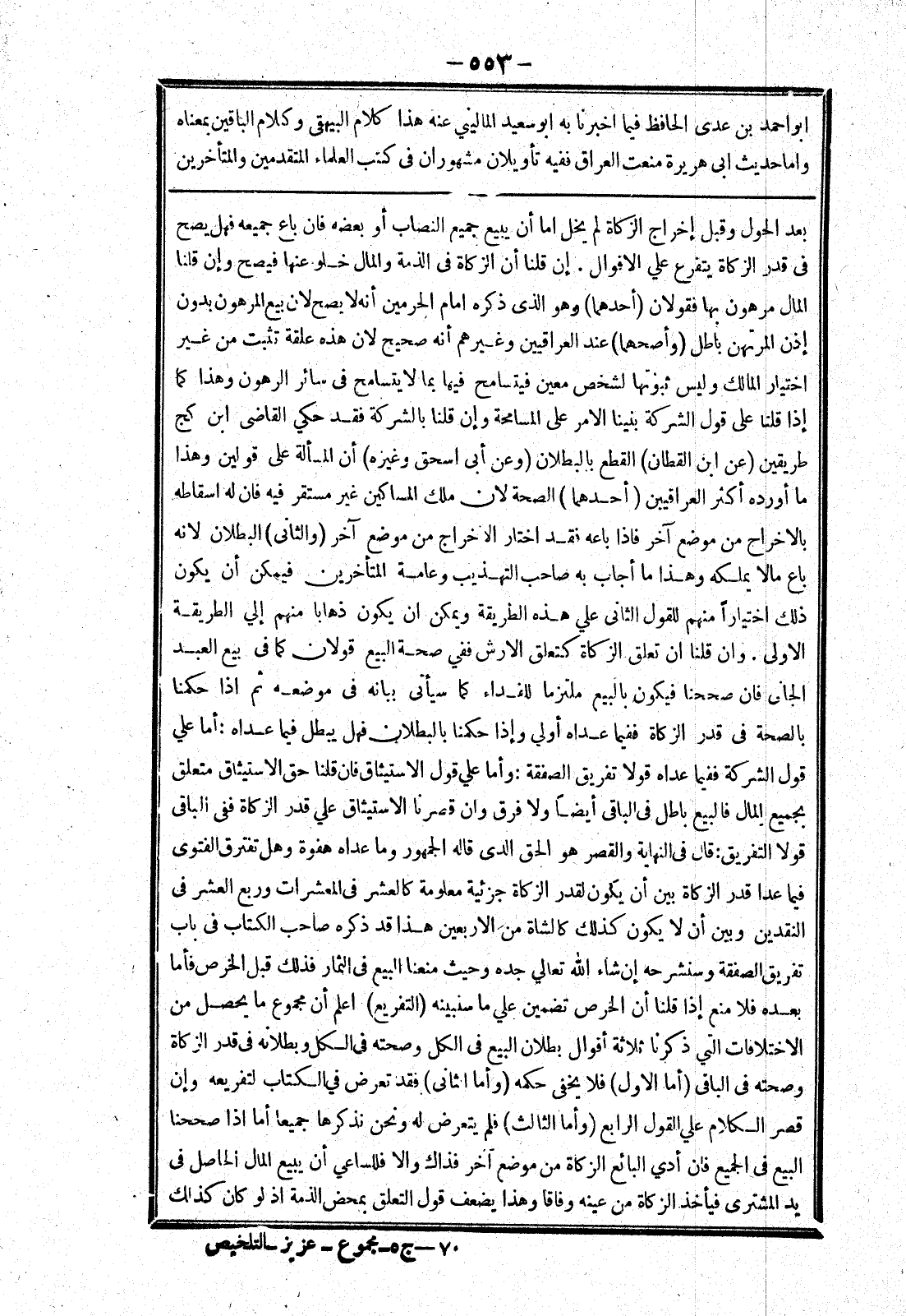 إن قلنا أن الزكاة في الذمة والمال خلو عنها فيصح وإن قلنا المال مرهون بها فقولان (أحدهما) وهو الذى ذكره امام الحرمين أنه لا يصح لان بيع المرهون بدون إذن المرتهن باطل (وأصحهما) عند العراقيين وغيرهم أنه صحيح لان هذه علقة تثبت من غير اختيار المالك وليس ثبوتها لشخص معين فيتسامح فيها بما لا يتسامح في سائر الرهون وهذا كما إذا قلنا على قول الشركة بنينا الامر على المسامحة وإن قلنا بالشركة فقد حكي القاضى ابن كج طريقين (عن ابن القطان) القطع بالبطلان (وعن أبى اسحق وغيره) أن المسألة على قولين وهذا ما أورده أكثر العراقيين (أحدهما) الصحة لان ملك المساكين غير مستقر فيه فان له اسقاطه بالاخراج من موضع آخر فإذا باعه فقد اختار الاخراج من موضع آخر (والثاني) البطلان لانه باع ما لا يملكه وهذا ما أجاب به صاحب التهذيب وعامة المتأخرين فيمكن أن يكون ذلك اختيارا منهم للقول الثاني علي هذه الطريقة ويمكن ان يكون ذهابا منهم إلي الطريقة الاولى.