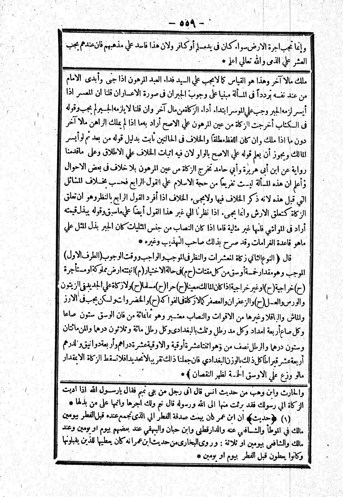 ما هو قاعدة الغرامات وقد صرح بذلك صاحب التهذيب وغيره * قال (النوع الثاني زكاة المعشرات والنظر في الموجب والواجب ووقت الوجوب (الطرف الاول) الموجب وهو مقدار خمسة أو سق من كل مقتات (ح م) في حالة الاختيار (م) انبتته ارض مملوكة أو مستأجرة (ح) خراجية (ح) أو غير خراجية إذا كان المالك معينا (ح) حرا (ح) مسلما (ح) ولا زكاة علي الجديد في الزيتون والورس والعسل (ح) والزعفران والعصفر كما لا زكاة في الفواكه (ح) والخضروات ولكن يجب في الارز والماش والباقلا وغيرها من الاقوات والنصاب معتبر وهو ثمانمائة من فان الوسق ستون صاعا وكل صاع أربعة امداد وكل مد رطل وثلث بالبغدادي وكل رطل مائة وثلاثون درهما والمن مائتان وستون درهما والرطل نصف من وهو اثنتا عشرة أو قية والاوقية عشرة دراهم وأربعة دوانيق والدرهم أربعة عشر قيراطا كل ذلك بالوزن البغدادي فان جعلنا ذلك تقريبا لا تحديدا فلا تسقط الزكاة الا بمقدار ما لو وزع علي الاوسق الخمسة لظهر النقصان) *