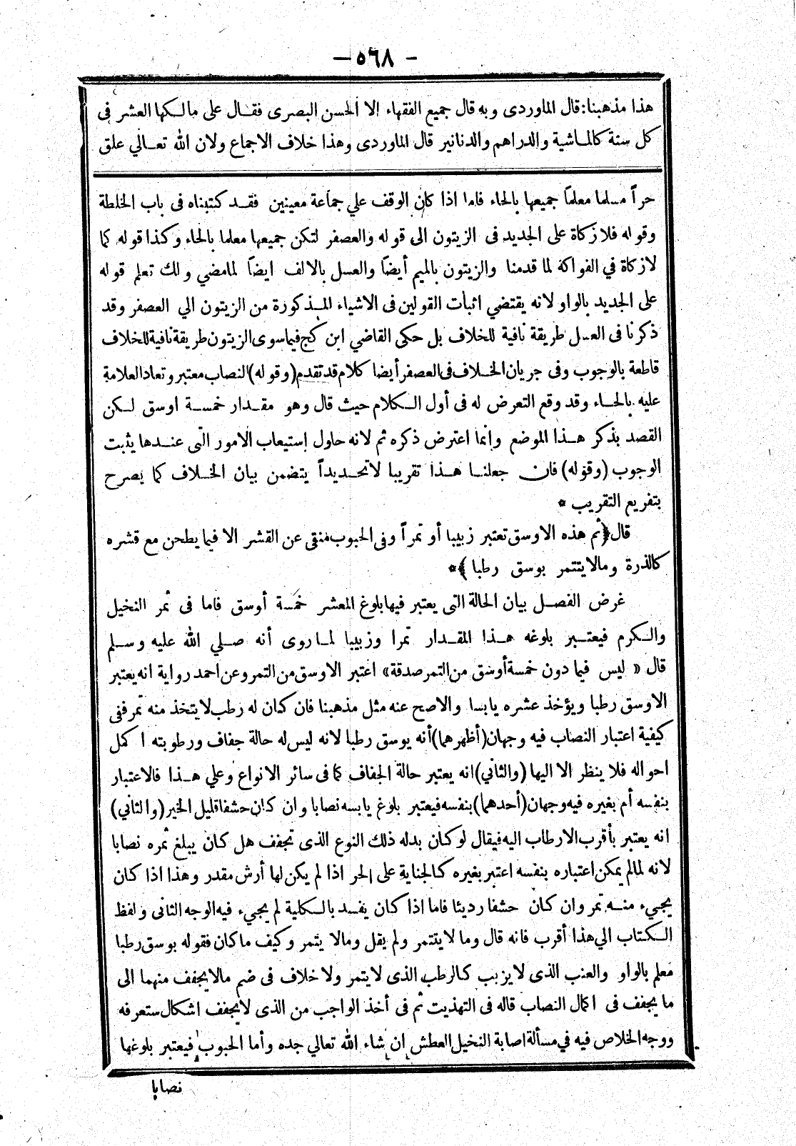 حرا مسلما معلما جميعها بالحاء فاما إذا كان الوقف علي جماعة معينين فقد كتبناه في باب الخلطة وقوله فلا زكاة على الجديد في الزيتون إلى قوله والعصفر لتكن جميعها معلما بالحاء وكذا قوله كما زكاة في الفواكه لما قدمنا والزيتون بالميم أيضا والعسل بالالف ايضا لما مضي ولك تعلم قوله على الجديد بالواو لانه يقتضي اثبات القولين في الاشياء المذكور من الزيتون الي العصفر وقد ذكرنا في العسل طريقة نافية للخلاف بل حكى القاضي ابن كج فيما سوى الزيتون طريقة نافية للخلاف قاطعة بالوجوب وفي جريان الخلاف في العصفر أيضا كلام قد تقدم (وقوله) النصاب معتبر وتعاد العلامة عليه بالحاء وقد وقع التعرض له في أول الكلام حيث قال وهو مقدر خمسة أو سق لكن القصد بذكر هذا الموضع وانما اعترض ذكره ثم لانه حاول استيعاب الامور التى عندها يثبت الوجوب (وقوله) فان جعلنا هذا تقريبا لا تحديدا يتضمن بيان الخلاف كما يصرح بتفريع التقريب * قال (ثم هذه الاوسق تعتبر زبيبا أو تمرا وفي الحبوب منقى عن القشر الا فيما يطحن مع قشره كالذرة ومالا يتتمر بوسق رطبا) * غرض الفصل بيان الحالة التى يعتبر فيها بلوغ المعشر خمسة أوسق فاما في ثمر النخيل والكرم فيعتبر بلوغه هذا المقدار تمرا وزبيبا لما روى أنه صلي الله عليه وسلم قال (ليس فيما دون خمسة أوسق من التمر صدقة) اعتبر الاوسق من التمر وعن احمد رواية انه يعتبر الاوسق رطبا ويؤخذا عشره يابسا والاصح عنه مثل مذهبنا فان كان له رطب لا يتخذ منه تمر ففى كيفية اعتبار النصاب فيه وجهان (أظهرهما) أنه يوسق رطبا لانه ليس له حالة جفاف ورطوبته اكمل احواله فلا ينظر الا إليها (والثاني) انه يعتبر حالة الجفاف كما في سائر الانواع وعلي هذا فالاعتبار