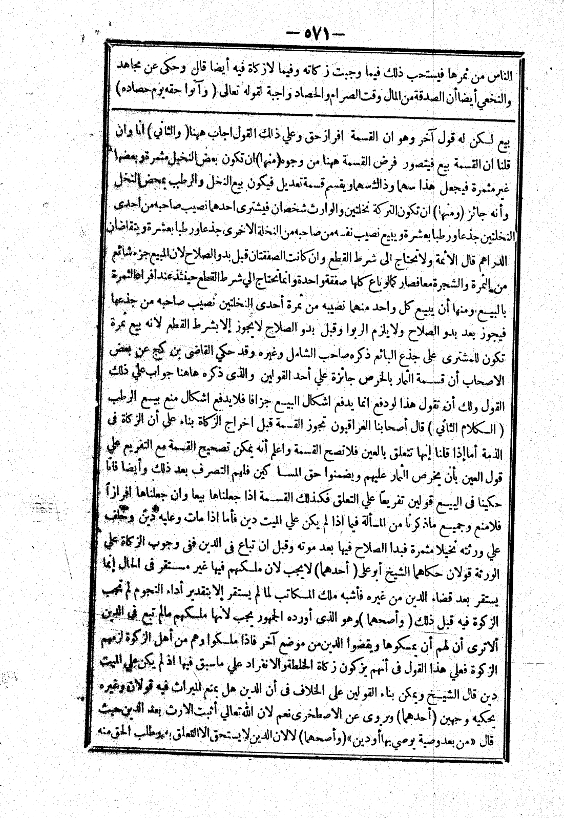 وأنه جائز (ومنها) ان تكون التركة نخلتين والوارث شخصان فيشترى احدهما نصيب صاحبه من احدى النخلتين جذعا ورطبا بعشرة ويبيع نصيب نفسه من صاحبه من النخلة الاخرى جذعا ورطبا بعشرة ويتقاضان الدراهم قال الائمة ولا تحتاج إلى شرط القطع وان كانت الصفقتان قبل بدو الصلاح لان المبيع جزء شائع من الثمرة والشجرة معا فصار كما لو باع كلها صفقة واحدة وانما تحتاج الي شرط القطع حينئذ عند افراد الثمرة بالبيع ومنا أن يبيع كل واحد منهما نصيبه من ثمرة أحدى النخلتين نصيب صاحبه من جذعها فيجوز بعد بدو الصلاح ولا يلزم الربوا وقبل بدو الصلاح لا يجوز إلا بشرط القطع لانه بيع ثمرة تكون للمشترى على جذع البائع ذكره صاحب الشامل وغيره وقد حكي القاضى بن كج عن بعض الاصحاب أن قسمة الثمار بالخرص جائزة علي أحد القولين والذى ذكره ها هنا جواب علي ذلك القول ولك أن تقول هذا لو دفع انما يدفع اشكال البيع جزافا فلا يدفع اشكال منع بيع الرطب (الكلام الثاني) قال أصحابنا العراقيون تجوز القسمة قبل اخراج الزكاة بناء على أن الزكاة في الذمة أما إذا قلنا إنها تتعلق بالعين فلا تصح القسمة واعلم أنه يمكن تصحيح القسمة مع التفريع علي قول العين بأن يخرص الثمار عليهم ويضمنوا حق المساكين فلهم التصرف بعد ذلك وأيضا فانا حكينا في البيع قولين تفريعا علي التعلق فكذلك القسمة إذا جعلناها بيعا وان جعلناها افرازا فلا منع وجميع ما ذكرنا من المسألة فيما إذا لم يكن علي الميت دين فأما إذا مات وعليه دين وخلف علي ورثته نخيلا مثمرة فبدا الصلاح فيها بعد موته وقبل ان تباع في الدين ففى وجوب الزكاة علي الورثة قولان حكاهما الشيخ أبو على (أحدهما) لا يجب لان ملكهم فيها غير مستقر في الحال إنما يستقر بعد قضاء الدين من غيره فأشبه ملك المكاتب لما لم يستقر إلا بتقدير أداء النجوم لم تجب الزكوة فيه قبل ذلك (وأصحهما) وهو الذى أورده الجمهور يجب لانها ملكهم ما لم تبع في الدين ألا ترى أن لهم أن يمسكوها ويقضوا الدين من موضع آخر فإذا ملكوا وهم من أهل الزكوة لزمهم الزكوة فعلي هذا القول في أنهم يزكون زكاة الخلطة والانفراد علي ما سبق فيها إذ لم يكن علي الميت دين قال الشيخ ويمكن بناء القولين على الخلاف في أن الدين هل يمنع الميراث فيه قولان وغيره يحكيه وجهين (أحدهما) ويروى عن الاصطخرى نعم لان الله تعالي أثبت الارث بعد الدين حيث
