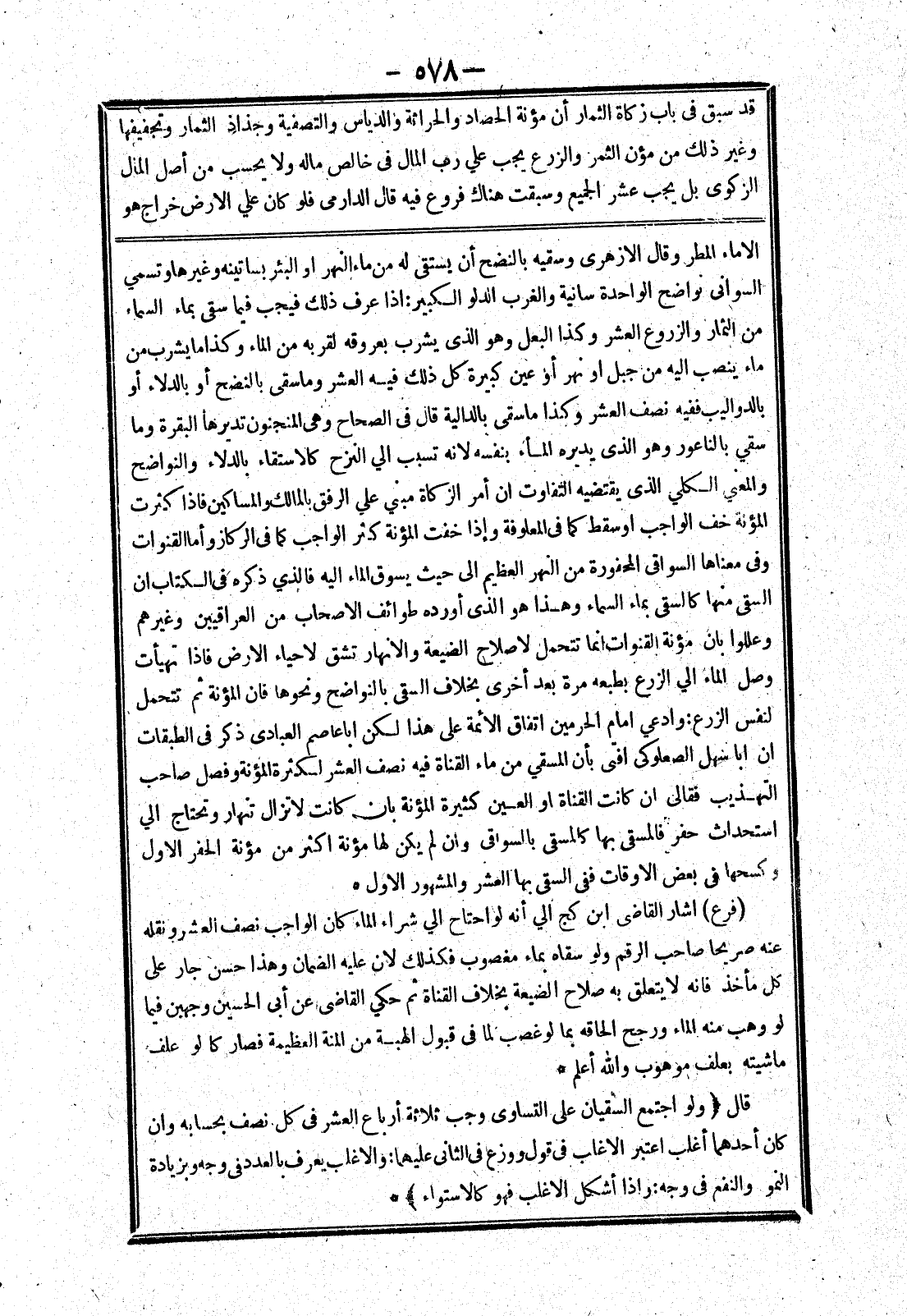 لنفس الزرع: وادعي امام الحرمين اتفاق الائمة على هذا لكن ابا عاصم العبادي ذكر في الطبقات ان ابا سهل الصعلوكى افتى بأن المسقي من ماء القناة فيه نصف العشر لكثرة المونة وفصل صاحب التهذيب فقالى ان كانت القناة أو العين كثيرة المونة بان كانت لا تزال تنهار وتحتاج الي استحداث حفر فالمسقى بها كالمسقي بالسواقي وان لم يكن لها مؤنة اكثر من مؤنة الحفر الاول وكسحها في بعض الاوقات ففى السقى بها العشر والمشهور الاول * (فرع) اشار القاضى ابن كج الي أنه لو احتاح الي شراء الماء كان الواجب نصف العشر ونقله عنه صريحا صاحب الرقم ولو سقاه بماء مغصوب فكذلك لان عليه الضمان وهذا حسن جار على كل مأخذ فانه لا يتعلق به صلاح الضيعة بخلاف القناة ثم حكي القاضى عن أبى الحسين وجهين فيما لو وهب منه الماء ورجح الحاقه بما لو غصب لما في قبول الهبة من المنة العظيمة فصاركا لو علف ماشيته بعلف موهوب والله أعلم * قال (ولو اجتمع السقيان على التساوى وجب ثلاثة أرباع العشر في كل نصف بحسابه وان كان أحدهما أغلب اعتبر الاغلب في قول ووزع في الثاني عليهما: والاغلب يعرف بالعدد في وجه وبزيادة النمو والنفع في وجه: وإذا أشكل الاغلب فهو كالاستواء) *