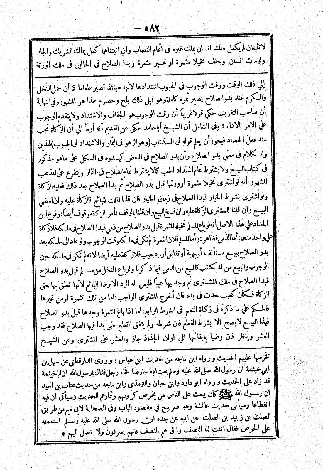 عند فعل الحصاد فيجوز أن يعلم قوله في الكتاب (وهو الزهو في الثمار والاشتداد في الحبوب لهذين والكلام في معني بدو الصلاح وأن بدو الصلاح في البعض كبدوه في الكل على ما هو مذكور في كتاب البيع ولا يشترط تمام اشتداد الحب كما لا يشترط تمام الصلاح في الثمار ويتفرع على المذهب المشهور أنه لو اشترى نخيلا مثمرة أو ورثها قبل بدو الصلاح ثم بدا الصلاح بعد ذلك فعليه الزكاة ولو اشترى بشرط الخيار فبدا الصلاح في زمان الخيار فان قلنا الملك للبائع فالزكاة عليه وان امضي البيع وان قلنا للمشترى الزكاة عليه وان فسخ البيع وان قلنا بالوقف فأمر الزكاة موقوف أيضا: وفرع ابن الحداد علي هذا الاصل أنه لو باع المسلم نخيله المثمرة قبل بدو الصلاح من ذمي فبدا الصلاح في ملكه فلا زكاة علي واحد منهما: أما الذمي فظاهر: وأما المسلم فلان الثمرة لم تكن في ملكه وقت الوجوب ولو عاد إلى ملكه بعد بدو الصلاح ببيع مستأنف أو بهبة أو تقابل أورد بعيب فلا زكاة عليه أيضا لانه لم تكن في ملكه حين الوجوب والبيع من المكاتب كالبيع من الذمي فيما ذكرنا ولو باع النخل من مسلم قبل بدو الصلاح فبدا الصلاح في ملك المشترى ثم وجد بها عيبا فليس له الرد الا برضا البائع لانها تعلق بها حق الزكاة فكان كعيب حدث في يده فان أخرج المشترى الواجب: اما من تلك الثمرة أو من غيرها فالحكم علي ما ذكرنا في زكاة النعم في الشرط الرابع: اما إذا باع الثمرة وحدها قبل بدو الصلاح فهذا البيع لا يصح الا بشرط القطع فان شرطه ولم يتفق القطع حتى بدا فيها الصلاح فقد وجب العشر وينظر فان رضيا بابقائها الي اوان الجذاذ جاز والعشر على المشترى وعن الشيخ