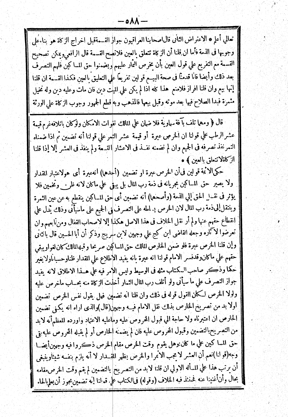 الزكاة لا تتعلق بالعين) * حكى الائمة قولين فيأن الخرص عبرة أو تضمين (أحدهما) انه عبرة أي هو لاعتبار المقدار ولا يصير حق المساكين بجريانه في ذمة رب المنال بل يبقى علي ما كان لانه ظن وتخمين فلا يؤثر في نقل الحق إلي الذمة (وأصحهما) أنه تضمين أي حق المساكين ينقطع به عن عين الثمرة وينتقل إلى ذمة رب المال لان الخرص يسلطه على التصرف في الجميع على ما سيأتي وذلك يدل علي انقطاع حقهم عنها ولم أر نقل الخلاف في هذا الاصل هكذا إلا لاصحاب القفال ومن تابعهم وان تعرضوا لآثاره وجعله القاضى ابن كج علي وجهين لابن سريج وذكر أن أبا الحسين قال بالثاني وإن قلنا الخرص عبرة فلو ضمن الخارص المالك حق المساكين صريحا وقبله المالك كان لغوا ويبقي حقهم علي ما كان وقد فسر الامام قولنا انه عبرة بانه يفيد الاطلاع علي المقدار ظناو حسبانا ولا يغير حكما وذكر صاحب الكتاب مثله في الوسيط وليس الامر فيه علي هذا الاطلاق لانه يفيد جواز التصرف علي ما سيأتي ولو أتلف رب المال الثمار أخذت الزكاة منه بحساب ما خرص عليه ولولا الخرص لكان القول قوله في ذلك وان قلنا انه تضمين فهل يقول نفس الخرص تضمين أو لابد من تصريح الخارص بذلك نقل الامام فيه وجهين (وقال) والذى اراه انه يكفى تضمين الخارص ان اعتبرناه ولا حاجة الي قبول المخروص عليه وما عليه الاعتماد واورده المعظم أنه لا بد من التصريح بالتضمين وقبول المخروص عليه فان لم يضمنه الخارص أو لم يقبله المخروص عليه بقى حق المساكين علي ما كان: وهل يقوم وقت الخرص مقام الخرص ذكروا فيه وجهين أيضا وجه (قولنا) نعم أن العشر لا يجب الا تمرا والخرص يظهر المقدار لا أنه يلزم بنفسه شيئا وينبغى أن يرتب هذا علي المسألة الاولي ان قلنا لا بد من التصريح بالتضمين لم يقم على وقت الخرص مقامه بحال وأن أغنينا عنه فحينئذ فيه الخلاف (وقوله) في الكتاب علي قولنا أنه تضمين يجوز أن يعلم بالحاء