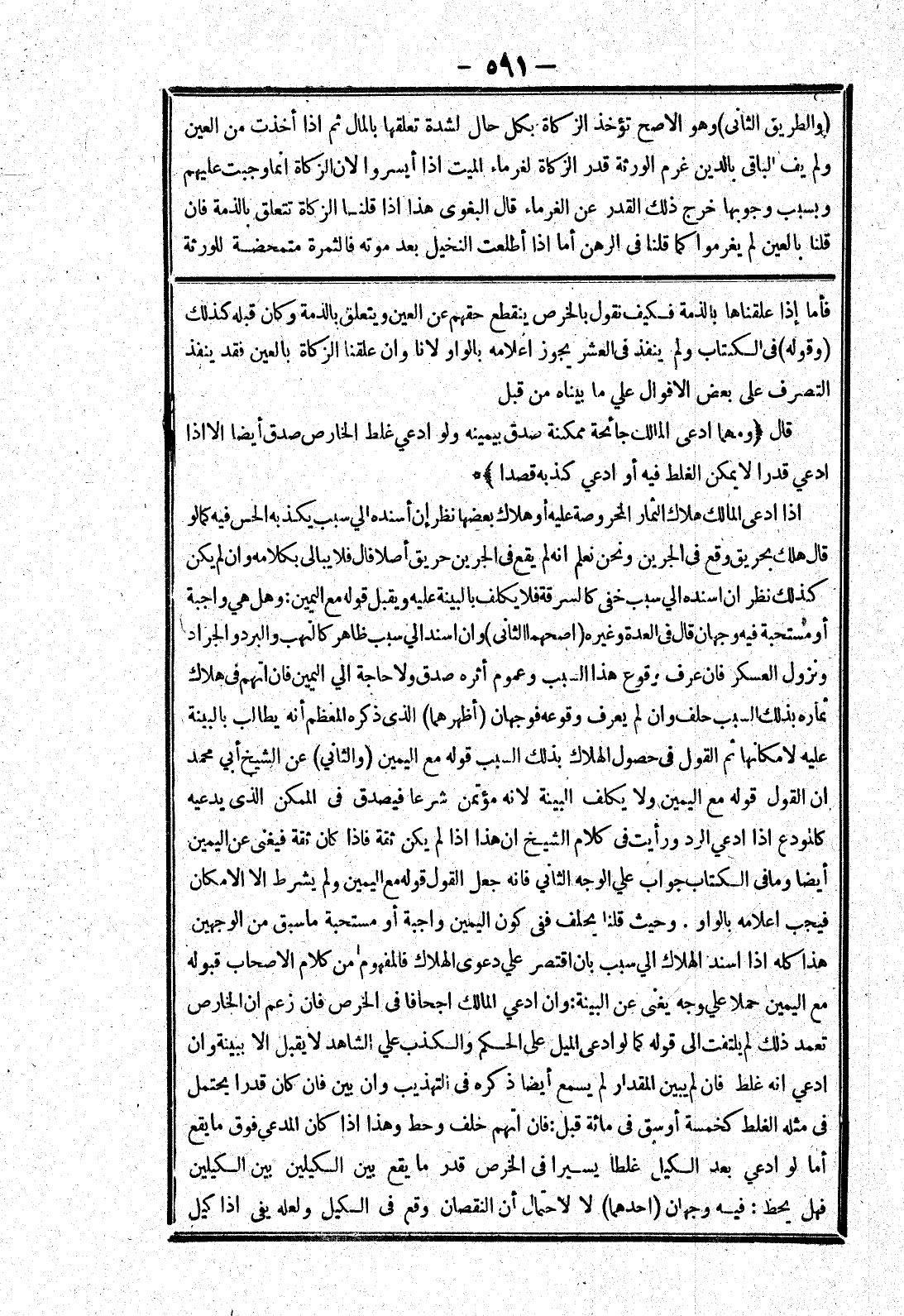 فأما إذا علقناها بالذمة فكيف نقول بالخرص ينقطع حقهم عن العين ويتعلق بالذمة وكان قبله كذلك (وقوله) في الكتاب ولم ينفذ في العشر يجوز اعلامه بالواو لانا وان علقنا الزكاة بالعين فقد ينفذ التصرف على بعضن الاقوال علي ما بيناه من قبل قال (ومهما ادعى المالك جائحة ممكنة صدق بيمينه ولو ادعي غلط الخارص صدق أيضا الا إذا ادعي قدرا لا يمكن الغلط فيه أو ادعي كذبه قصدا) * إذا ادعى المالك هلاك الثمار المخروصة عليه أو هلاك بعضها نظر إن أسنده إلي سبب يكذبه الحسن فيه كما لو قال هلك بحريق وقع في الجرين ونحن نعلم انه لم يقع في الجرين حريق أصلا قال فلا يبالى بكلامه وان لم يكن كذلك نظر ان اسنده الي سبب خفى كالسرقة فلا يكلف بالبين عليه ويقبل قوله مع اليمين: وهل هي واجبة أو مستحبة فيه وجهان قال في العدة وغيره (اصحهما الثاني) وان اسند الي سبب ظاهر كالنهب والبرد والجراد ونزول العسكر فان عرف وقوع هذا السبب وعموم أثره صدق ولا حاجة الي اليمين فان اتهم في هلاك ثماره بذلك السبب حلف وان لم يعرف وقوعه فوجهان (أظهرهما) الذى ذكره المعظم أنه يطالب بالبينة عليه لامكانها ثم القول في حصول الهلاك بذلك السبب قوله مع اليمين (والثاني) عن الشيخ أبي محمد ان القول قوله مع اليمين ولا يكلف البينة لانه مؤتمن شرعا فيصدق في الممكن الذى يدعيه كالمودع إذا ادعي الرد ورأيت في كلام الشيخ ان هذا إذا لم يكن ثقة فإذا كان ثقة فيغنى عن اليمين أيضا وما في الكتاب جواب علي الوجه الثاني فانه جعل القول قوله مع اليمين ولم يشرط الا الامكان فيجب اعلامه بالواو.