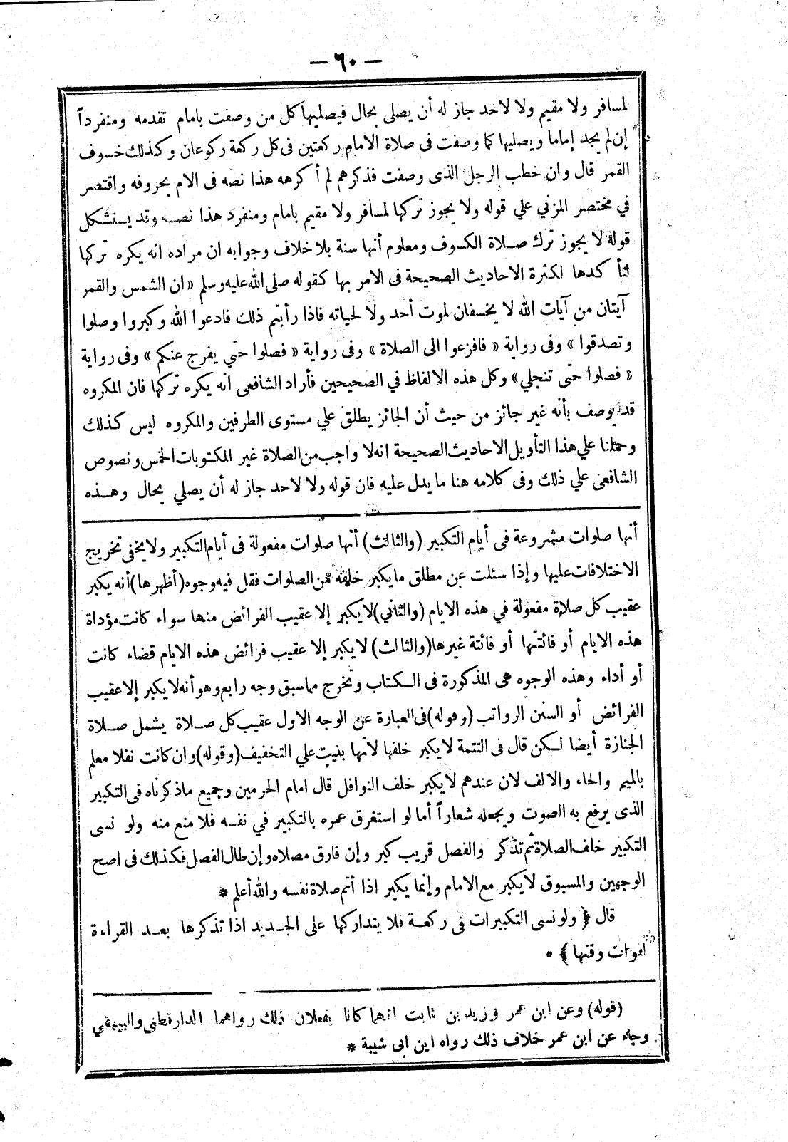 أنها صلوات مشروعة في أيام التكبير (والثالث) أنها صلوات مفعولة في أيام التكبير ولا يخفى تخريج الاختلافات عليها وإذا سئلت عن مطلق ما يكبر خلفه من الصلوات فقل فيه وجوه (أظهرها) أنه يكبر عقيب كل صلاة مفعولة في هذه الايام (والثاني) لا يكبر إلا عقيب الفرائض منها سواء كانت مؤداة هذه الايام أو فائتتها أو فائتة غيرها (والثالث) لا يكبر إلا عقيب فرائض هذه الايام قضاء كانت أو أداء وهذه الوجوه هي المذكورة في الكتاب وتخرج مما سبق وجه رابع وهو أنه لا يكبر إلا عقيب الفرائض أو السنن الرواتب (وقوله) في العبارة عن الوجه الاول عقيب كل صلاة يشمل صلاة الجنازة أيضا لكن قال في التتمة لا يكبر خلفها لانها بنيت علي التخفيف (وقوله) وان كانت نفلا معلم بالميم والحاء والالف لان عند هم لا يكبر خلف النوافل قال امام الحرمين وجميع ما ذكرناه في التكبير الذى يرفع به الصوت ويجعله شعارا أما لو استغرق عمره بالتكبير في نفسه فلا منع منه ولو نسى التكبير خلف الصلاة ثم تذكر والفصل قريب كبر وإن فارق مصلاه وإن طال الفصل فكذلك في اصح الوجهين والمسبوق لا يكبر مع الامام وإنما يكبر إذا أتم صلاة نفسه والله أعلم * قال (ولو نسى التكبيرات في ركعة فلا يتداركها على الجديد إذا تذكرها بعد القراءة لفوات وقتها) *
