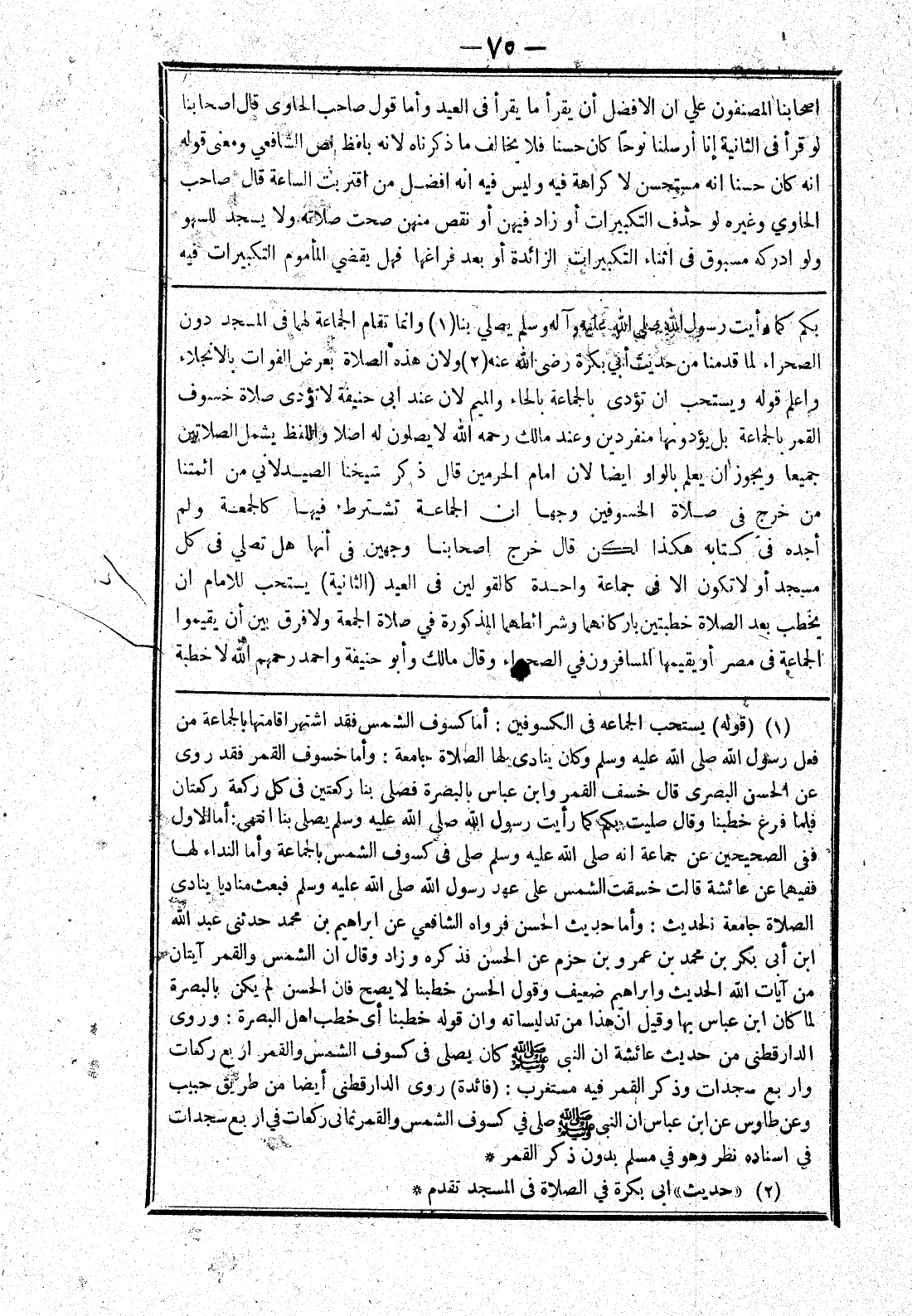 بكم كما رأيت رسول الله صلى الله عليه وسلم يصلي بنا وانما تقام الجماعة لهما في المسجد دون الصحراء لما قدمنا من حديث أبي بكرة رضى الله عنه ولان هذه الصلاة بعرض الفوات بالانجلاء واعلم قوله ويستحب ان تؤدى بالجماعة بالحاء والميم لان عند ابى حنيفة لا تؤدى صلاة خسوف القمر بالجماعة بل يؤدونها منفردين وعند مالك رحمه الله لا يصلون له اصلا واللفظ يشمل الصلاتين جميعا ويجوز ان يعلم بالوار ايضا لان امام الحرمين قال ذكر شيخنا الصيد لاني من ائمتنا من خرج في صلاة الخسوفين وجها ان الجماعة تشترط فيها كالجمعة ولم أجده في كتابه هكذا لكن قال خرج اصحابنا وجهين في أنها هل تصلي في كل