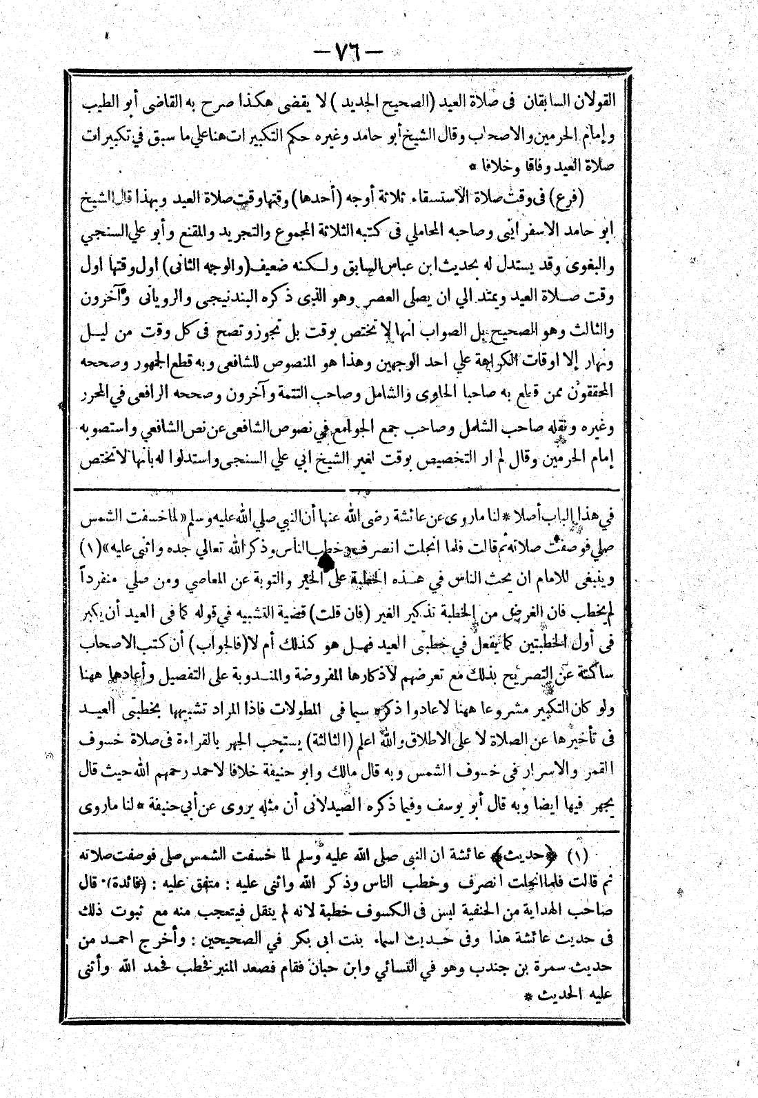 في هذا الباب أصلا * لنا ما روى عن عائشة رضى الله عنها أن النبي صلي الله عليه وسلم (لما خسفت الشمس صلي فوصفت صلاته ثم قالت فاما انجلت انصرف وخطب الناس وذكر الله تعالي جده واثنى عليه) وينبغى للامام ان يحث الناس في هذه الخطبة على الخير والوبة عن المعاصي ومن صلي منفردا لم يخطب فان الغرض من الخطبة تذكير الغير (فان قلت) قضية التشبيه في قوله كما في العيد أن يكبر في أول الخطبتين كما يفعل في خطبتى العيد فهل هو كذلك أم لا (فالجواب) أن كتب الاصحاب ساكتة عن التصريح بذك مع تعرضهم لاذكارها المفروضة والمندوبة على التفصيل وأعادها ههنا ولو كان التكبير مشروعا ههنا لا عادوا ذكره سيما في المطولات فإذا المراد تشبيهها بخطبتى العيد في تأخيرها عن الصلاة لا على الاطلاق والله اعلم (الثالثة) يستحب الجهر بالقراءة في صلاة خسوف القمر والاسرار في خسوف الشمس وبه قال مالك وابو حنيفة خلافا لاحمد رحمهم الله حيث قال يجهر فيها ايضا وبه قال أبو يوسف وفيما ذكره الصيدلانى أن مثله يروى عن أبي حنيفة لنا ما روى