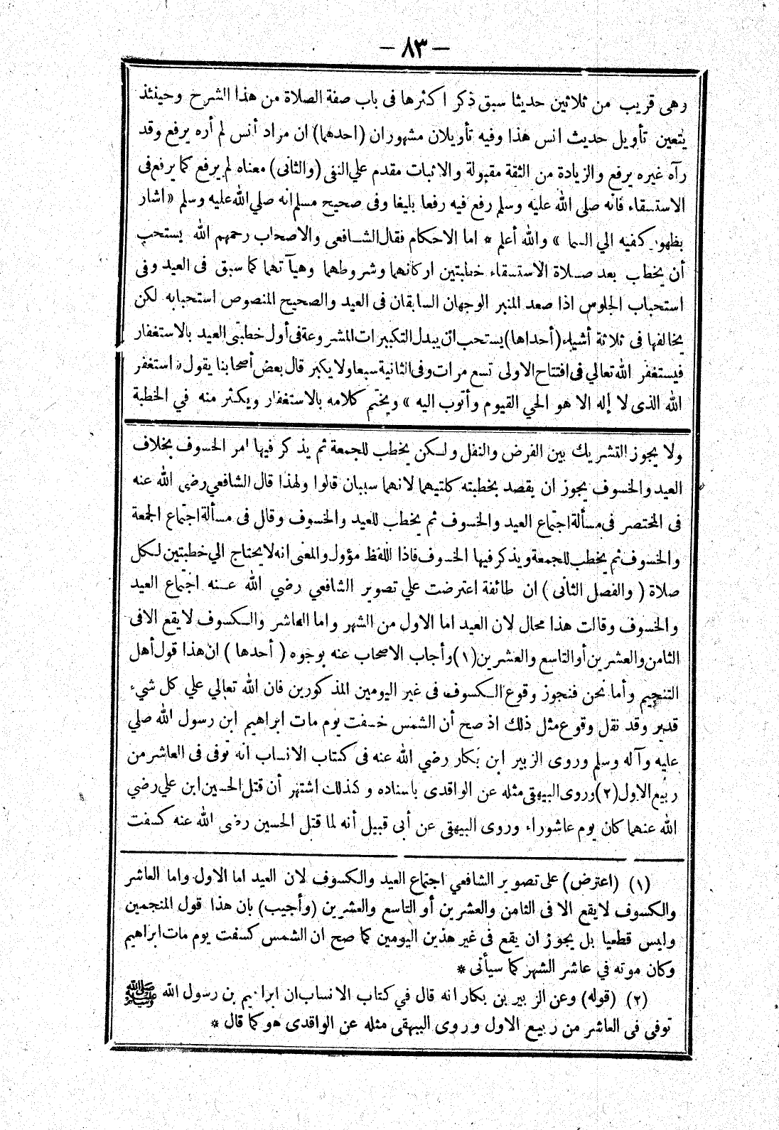 ولا يجوز التشريك بين الفرض والنفل ولكن يخطب للجمعة ثم يذكر فيها امر الحسوف بخلاف العيد والخسوف يجوز ان يقصد بخطبته كلتيهما لانهما سببان قالوا ولهذا قال الشافعي رضى الله عنه في المختصر في مسألة اجتماع العيد والخسوف ثم يخطب للعيد والخسوف وقال في مسألة اجتماع الجمعة والخسوف ثم يخطب للجمعة ويذكر فيها الخسوف فإذا اللفظ مؤول والمعنى انه لا يحتاج الي خطبتين لكل صلاة (والفصل الثاني) ان طائفة اعترضت علي تصوير الشافعي رضي الله عنه اجتماع العيد والخسوف وقالت هذا محال لان العيد اما الاول من الشهر واما العاشر والكسوف لا يقع الا في الثامن والعشرين أو التاسع والعشرين وأجاب الاصحاب عنه بوجوه (أحدها) ان هذا قول اهل التنجيم وأما نحن فنجوز وقوع الكسوف في غير اليومين المذكورين فان الله تعالي علي كل شئ قدير وقد نقل وقوع مثل ذلك إذا صح أن الشمس خسفت يوم مات ابراهيم بن رسول الله صلي عليه وسلم وروى الزبير ابن بكار رضي الله عنه في كتاب الانساب انه توفى في العاشر من ربيع اول وروى البيهقى مثله عن الواقدي باسناده وكذلك اشتهر أن قتل الحسين ابن علي رضي الله عنهما كان يوم عاشوراء وروى البيهقى عن أبى قبيل أنه لما قتل الحسين رضى الله عنه كسفت