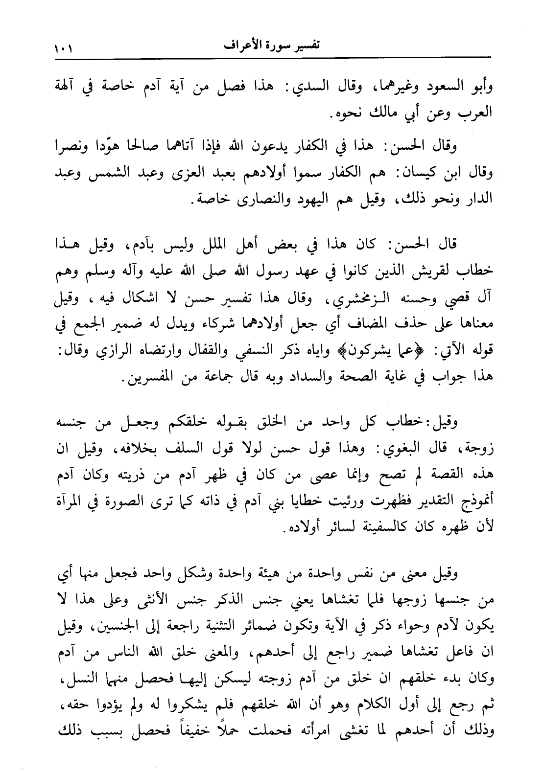 قال الحسن: كان هذا في بعض أهل الملل وليس بآدم، وقيل هذا خطاب لقريش الذين كانوا في عهد رسول الله صلى الله عليه وآله وسلم وهم آل قصي وحسنه الزمخشري، وقال هذا تفسير حسن لا إشكال فيه، وقيل معناها على حذف المضاف أي جعل أولادهما شركاء ويدل له ضمير الجمع في قوله الآتي: (عما يشركون) وإياه ذكر النسفي والقفال وارتضاه الرازي وقال: هذا جواب في غاية الصحة والسداد وبه قال جماعة من المفسرين.