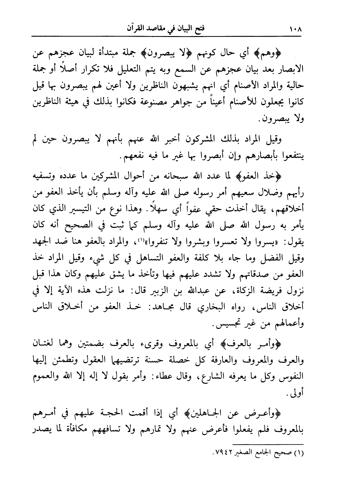 (خذ العفو) لما عدد الله سبحانه من أحوال المشركين ما عدده وتسفيه رأيهم وضلال سعيهم أمر رسوله صلى الله عليه وآله وسلم بأن يأخذ العفو من أخلاقهم، يقال أخذت حقي عفواً أي سهلاً. وهذا نوع من التيسير الذي كان يأمر به رسول الله صلى الله عليه وآله وسلم كما ثبت في الصحيح أنه كان يقول: " يسروا ولا تعسروا وبشروا ولا تنفروا " (¬1)، والمراد بالعفو هنا ضد الجهد وقيل الفضل وما جاء بلا كلفة والعفو التساهل في كل شيء وقيل المراد خذ العفو من صدقاتهم ولا تشدد عليهم فيها وتأخذ ما يشق عليهم وكان هذا قبل نزول فريضة الزكاة، عن عبد الله بن الزبير قال: ما نزلت هذه الآية إلا في أخلاق الناس، رواه البخاري قال مجاهد: خذ العفو من أخلاق الناس وأعمالهم من غير تجسيس.